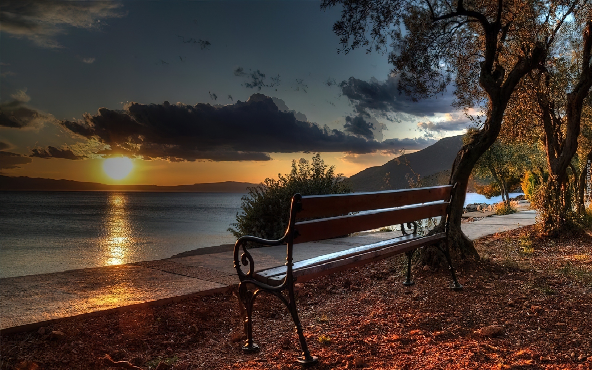 Edytor tapety: Zachód Słońca, Ławka, Morze