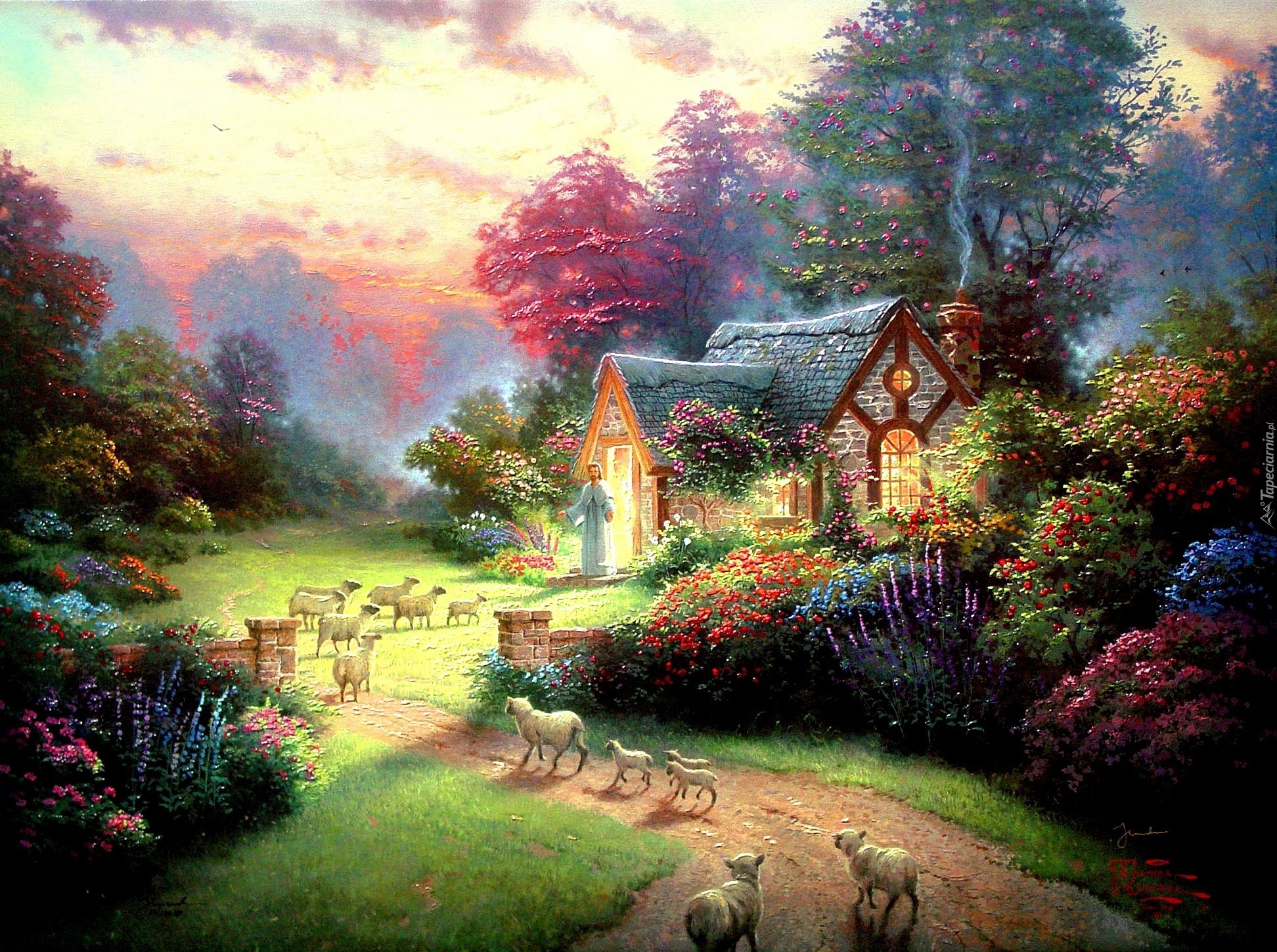 Edytor tapety: Dom, Droga, Owieczki, Thomas Kinkade