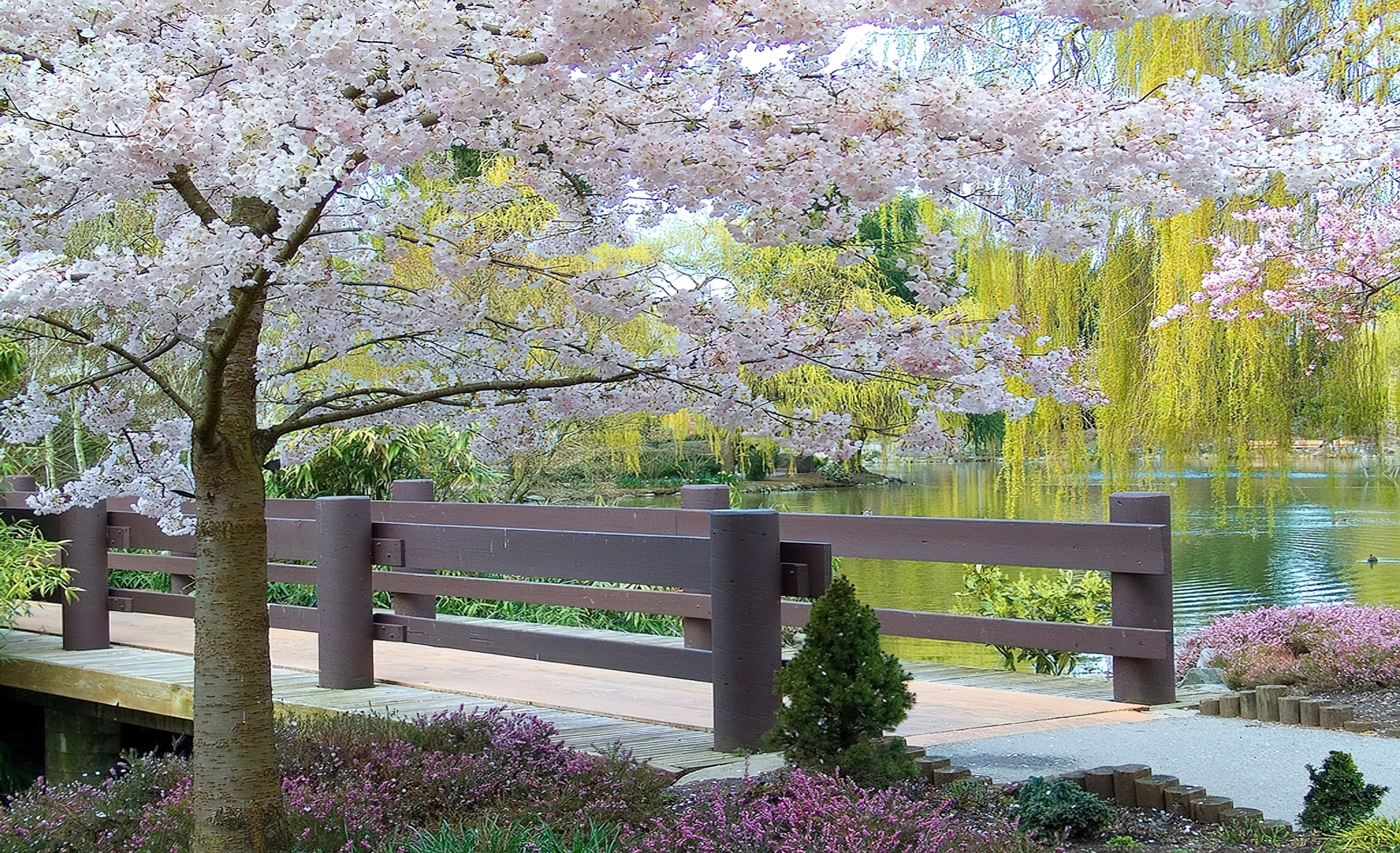 Edytor tapety: Wiosna, Mostek, Staw, Kwitnące, Drzewa