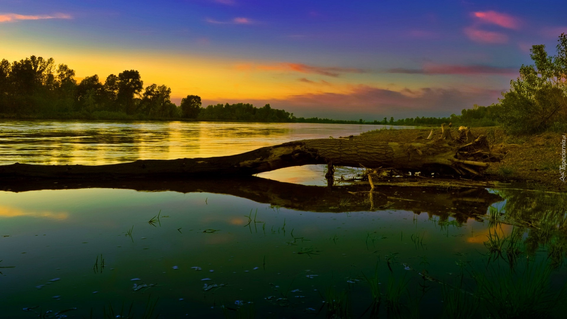 Edytor tapety: Jezioro, Zachód, Słońca, Konar, Drzewa