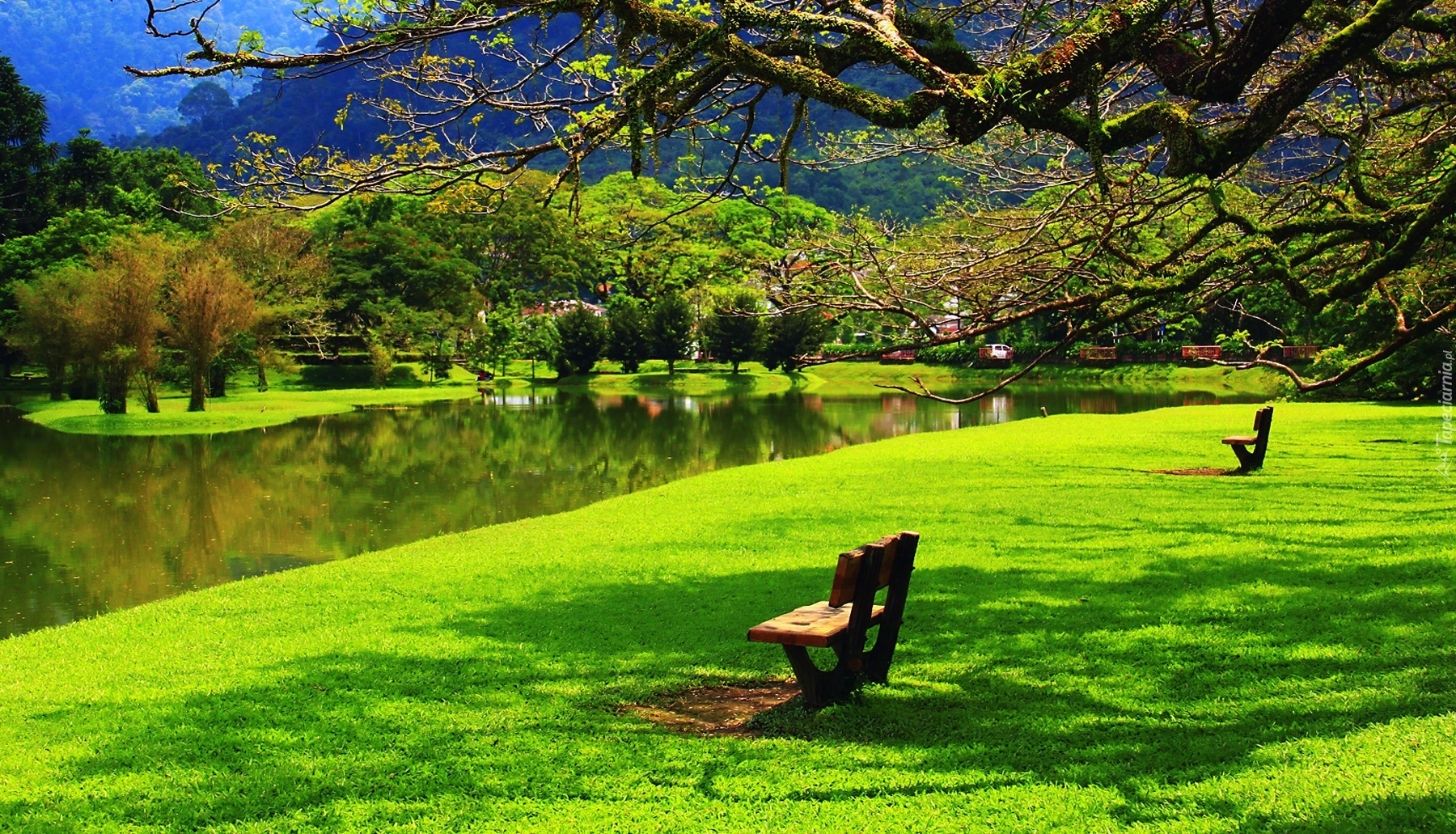 Edytor tapety: Park, Rzeka, Drzewa, Ławeczki