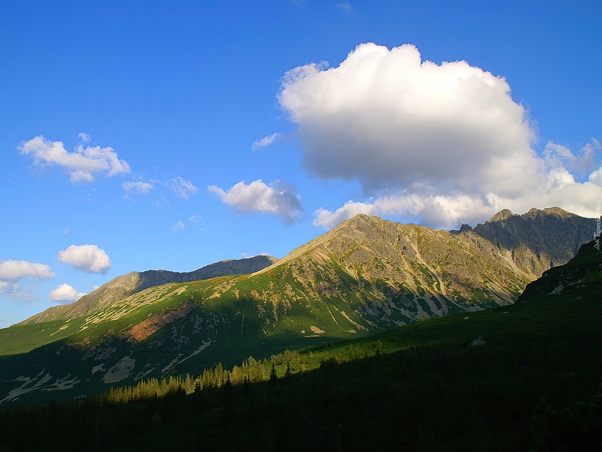 Edytor tapety: Góry, Chmury, Niebo, Las, Łąka