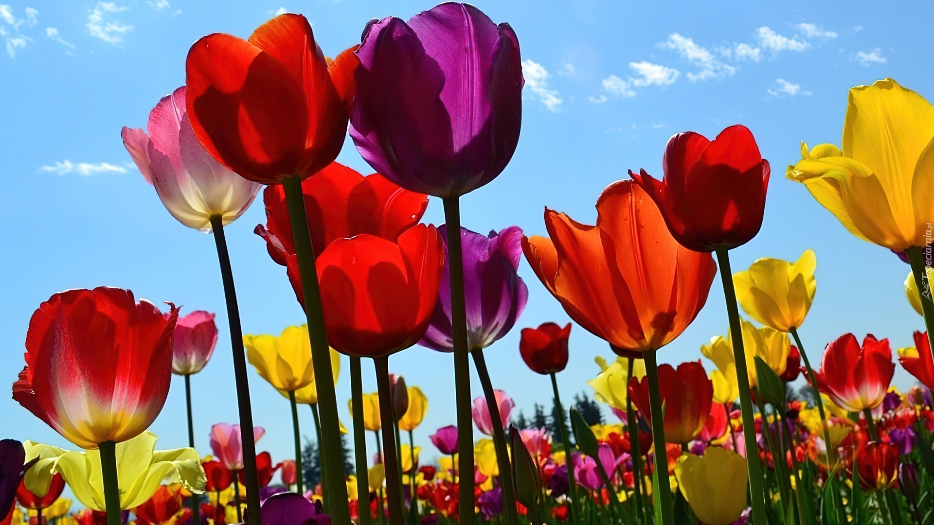 Edytor tapety: Kwiaty, Kolorowe, Tulipany, Niebo