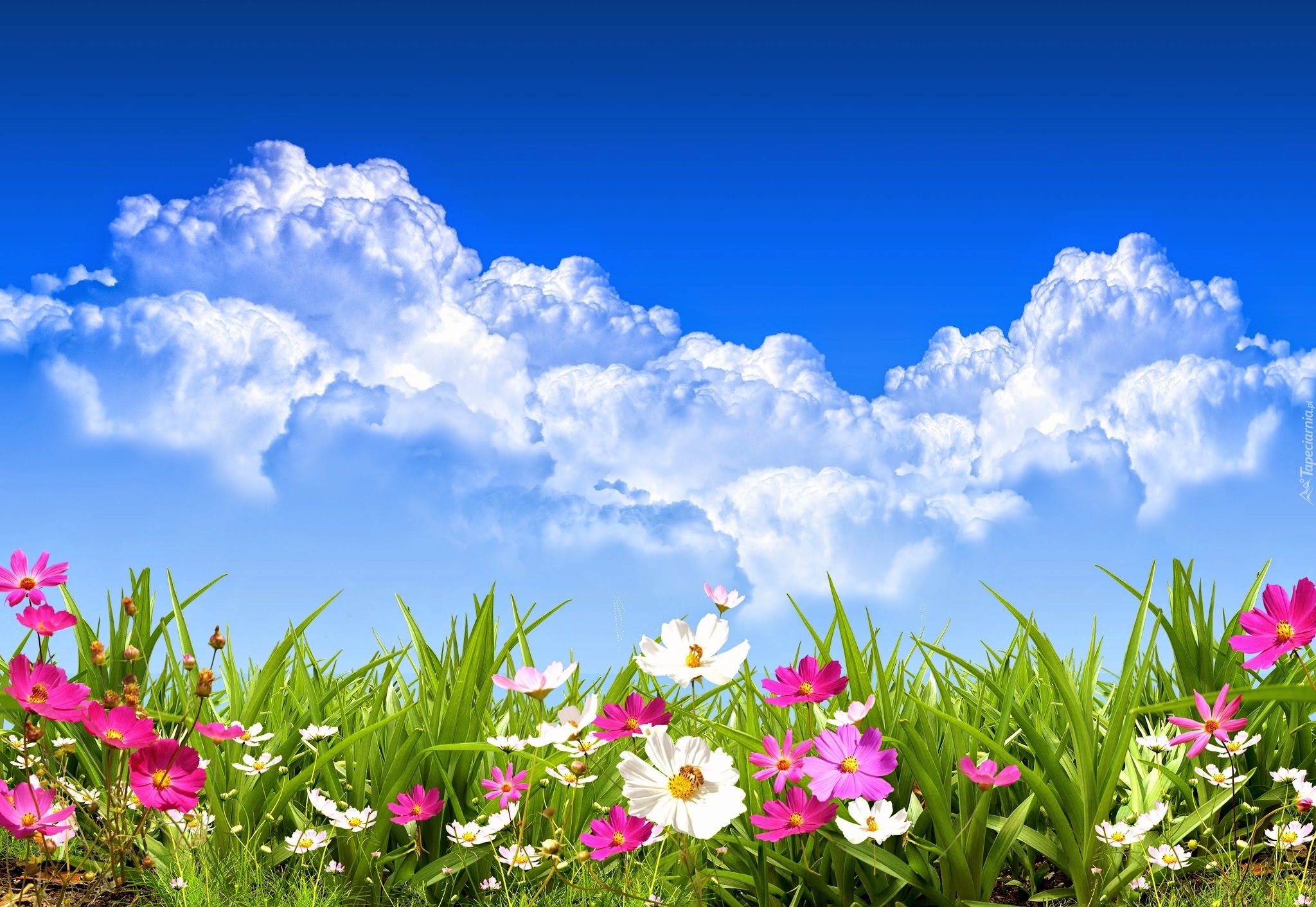 Edytor tapety: Łąka, Kwiaty, Chmury