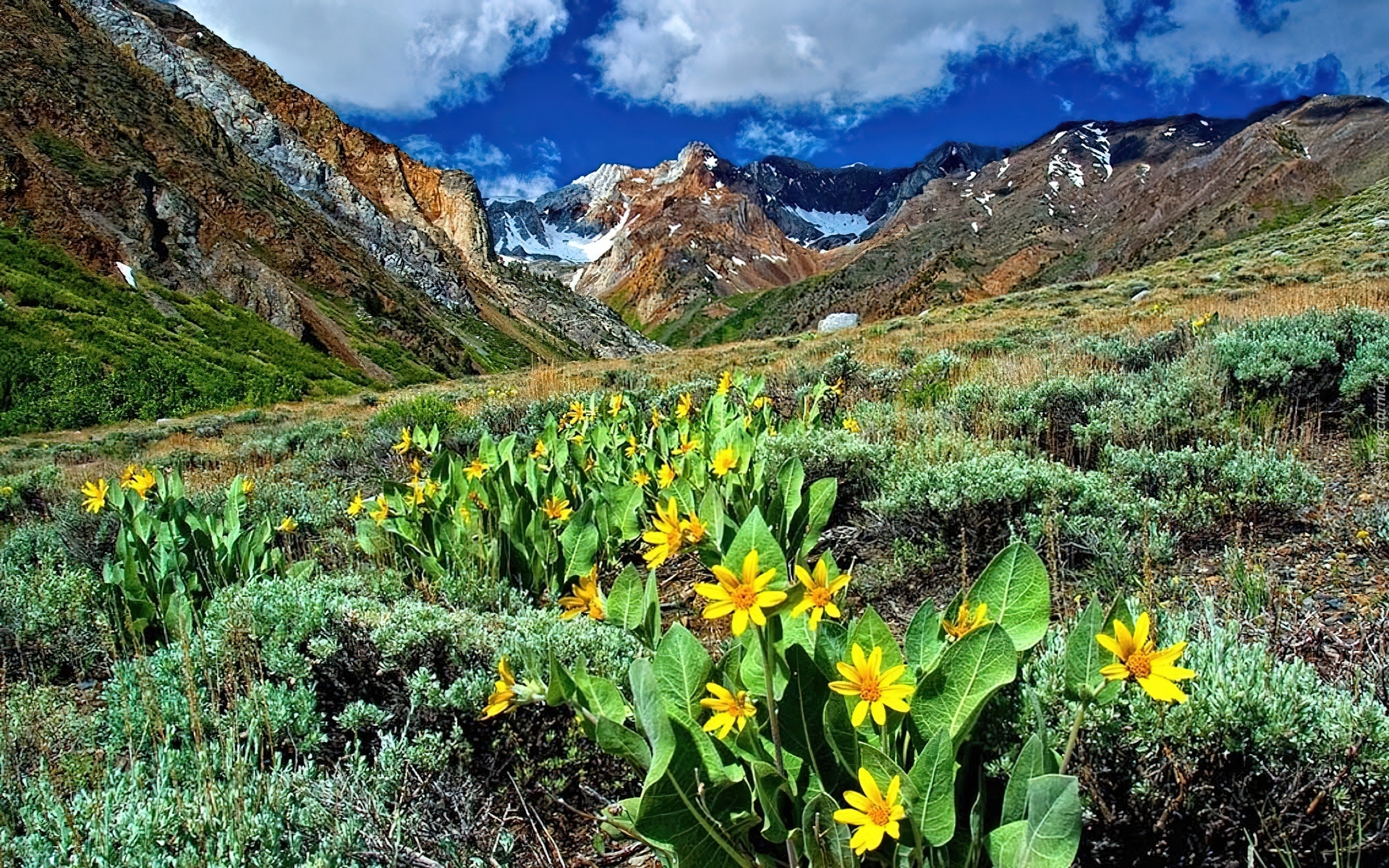 Edytor tapety: Łąka, Kwiaty, Góry, Chmury