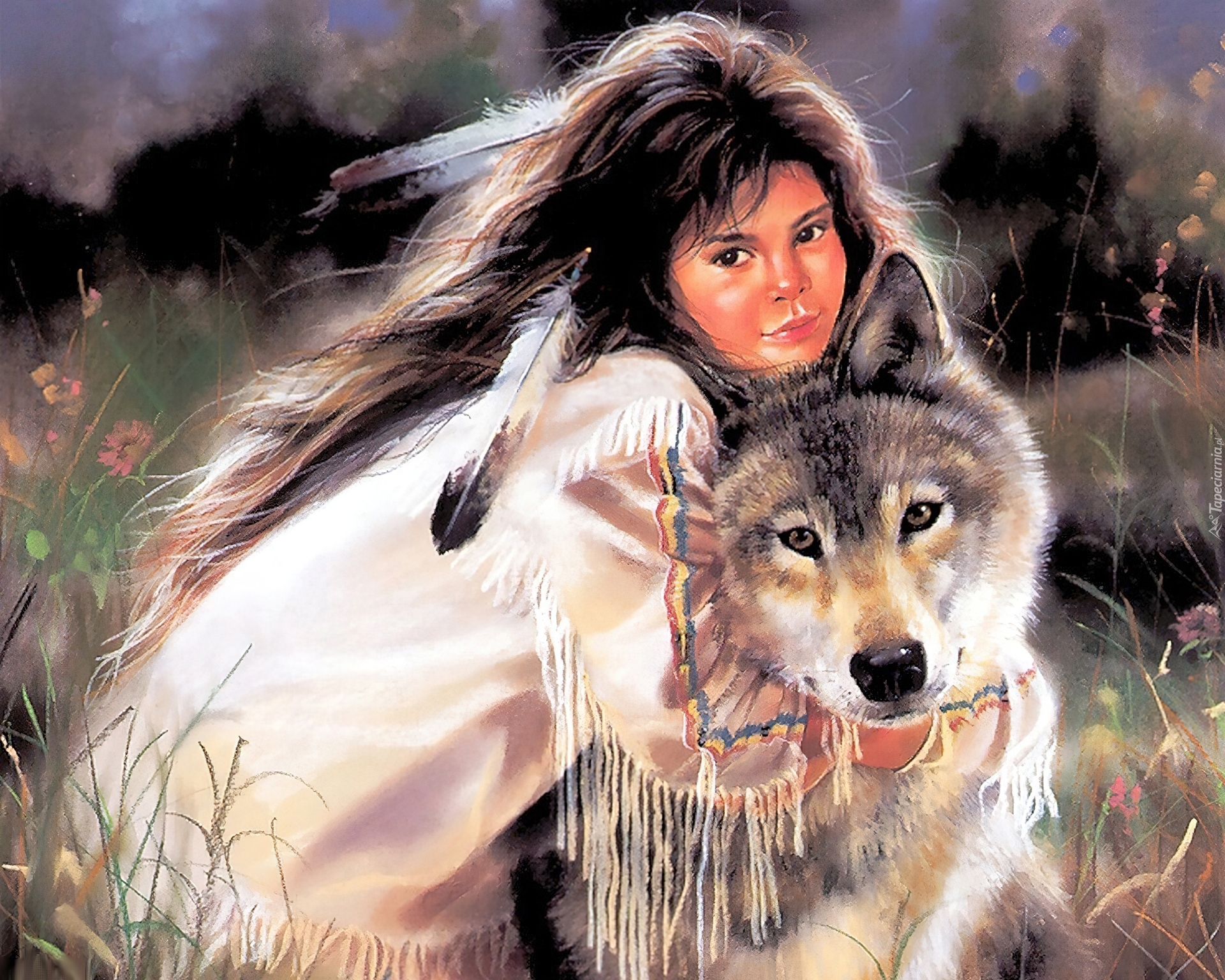 Edytor tapety: Dziewczynka, Indianka, Wilk