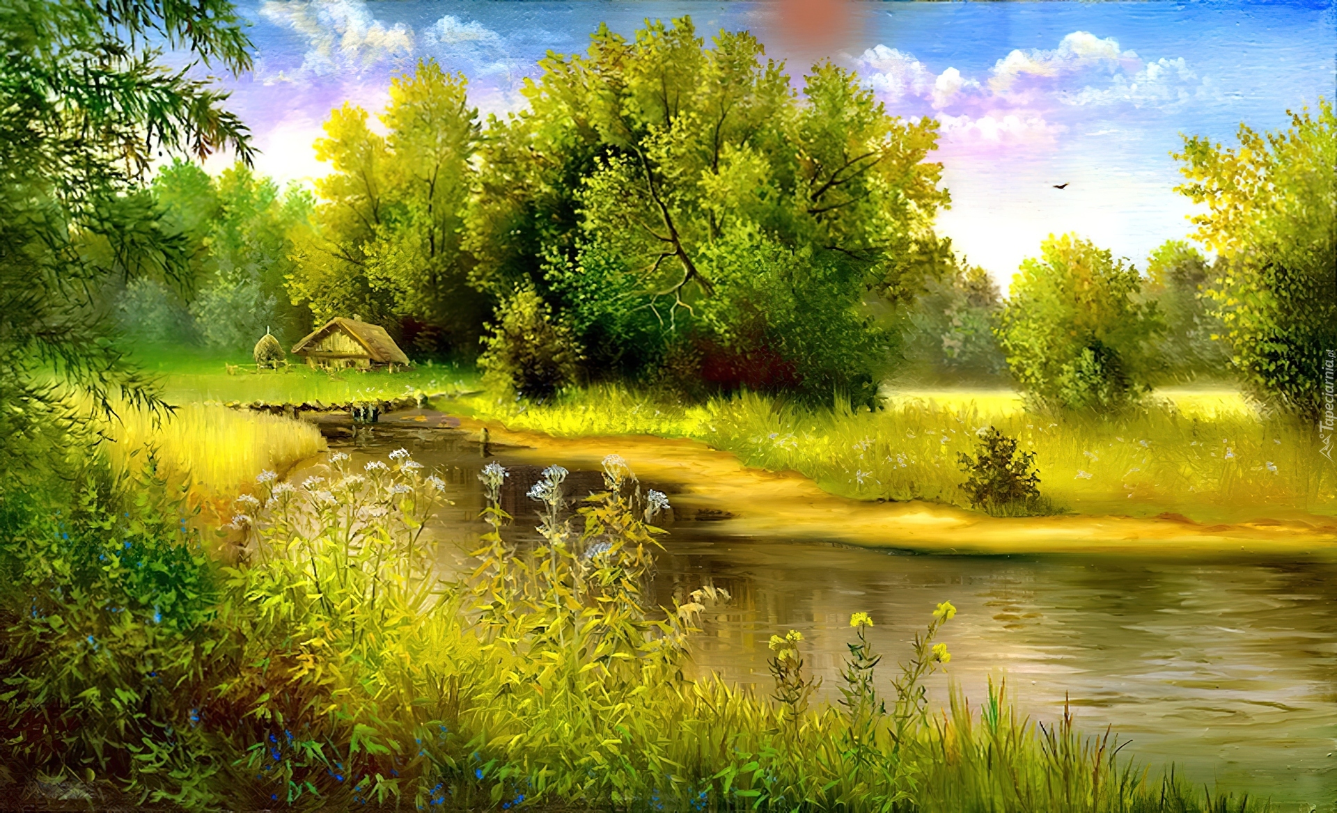 Edytor tapety: Rzeka, Łąka, Drzewa
