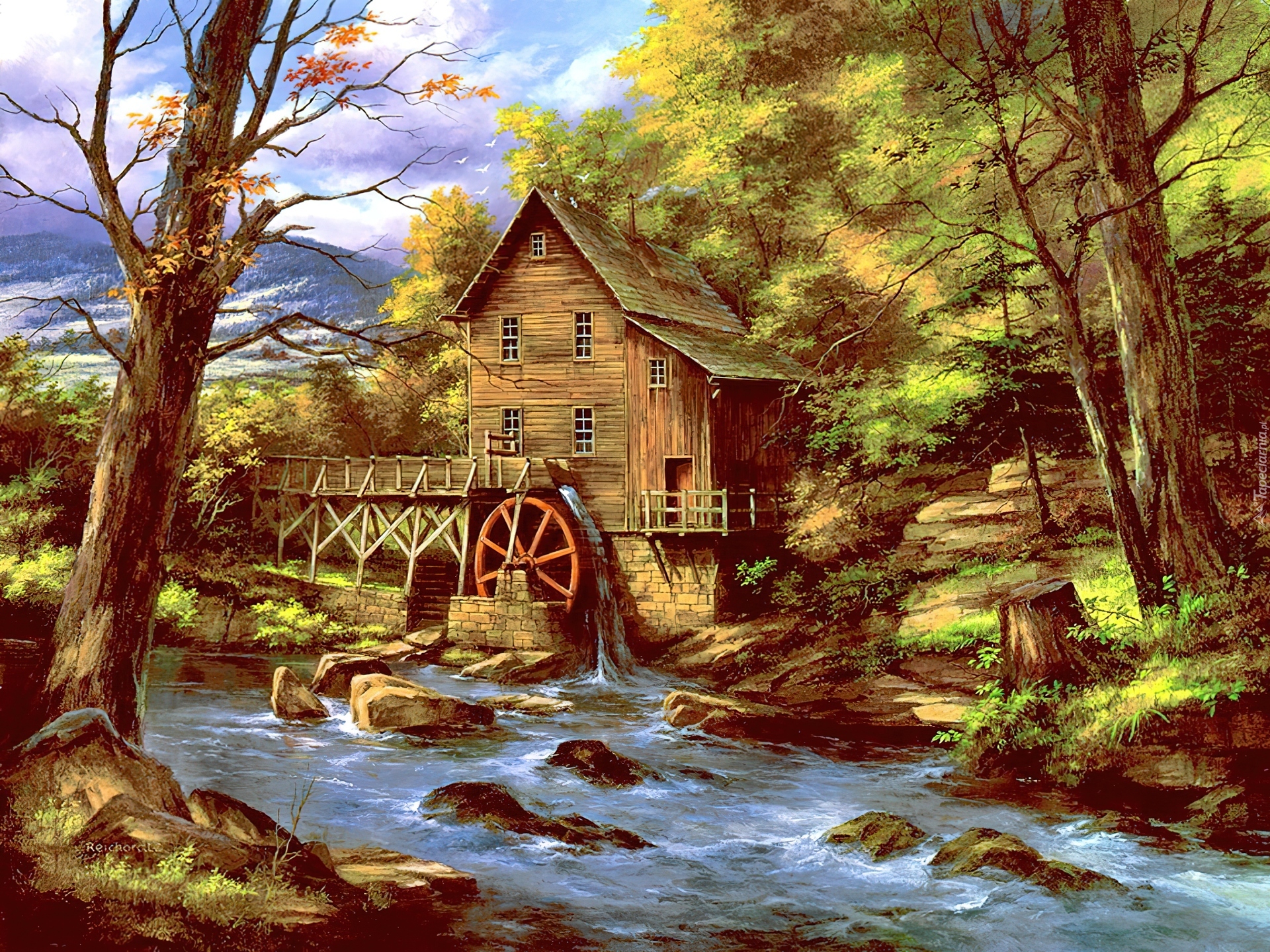 Edytor tapety: Młyn, Rzeka, Kamienie