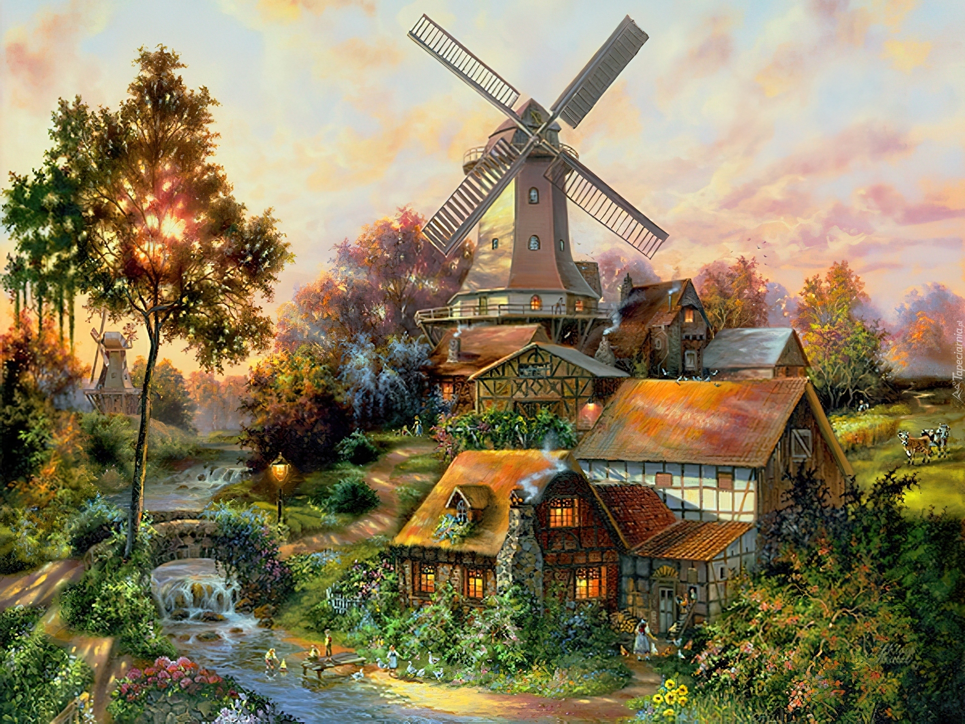 Edytor tapety: Domy, Wiatrak, Rzeka