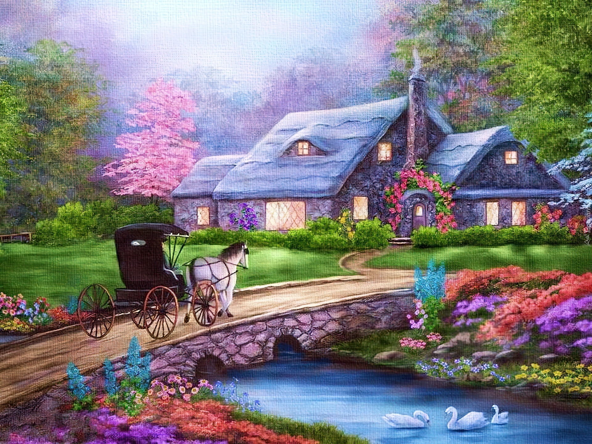 Edytor tapety: Dom, Most, Rzeka, Kwiaty, Łabędzie, Powóz