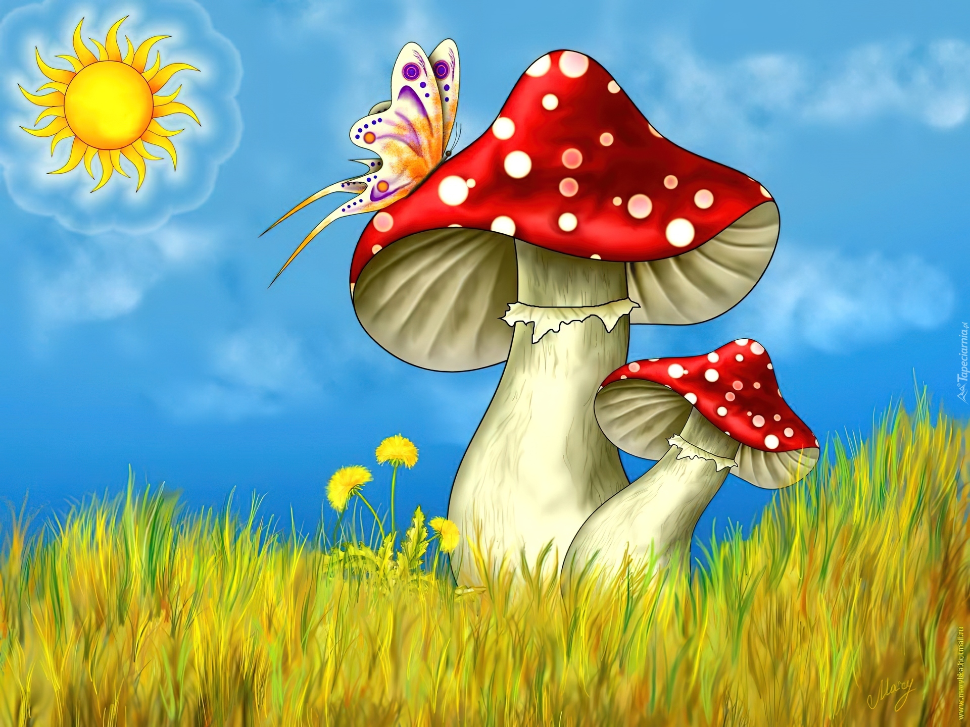 Edytor tapety: Grzyby, Muchomory, Motyl, Słońce
