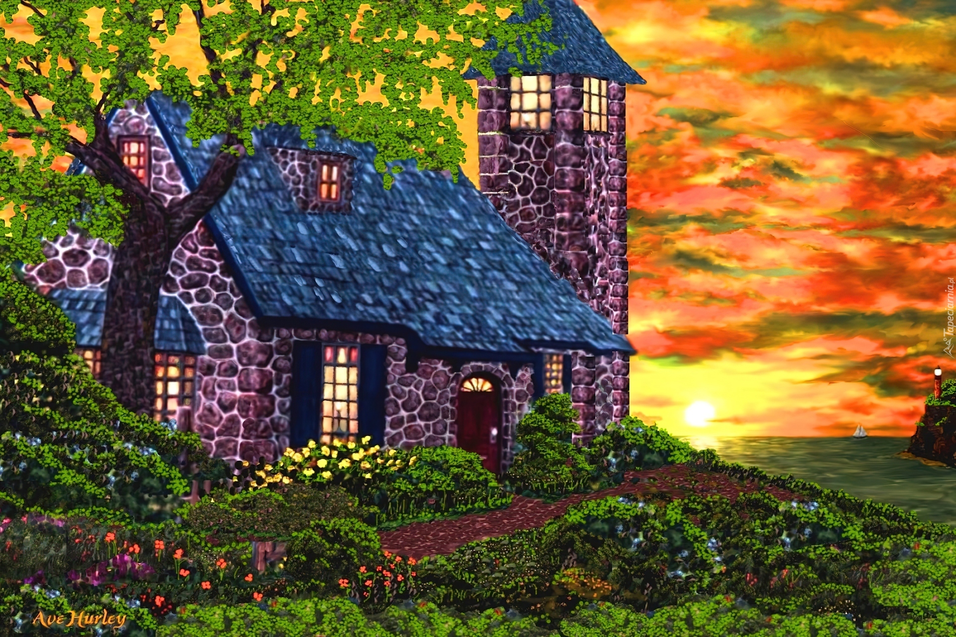 Edytor tapety: Dom, Wieża, Ogród, Kwiaty