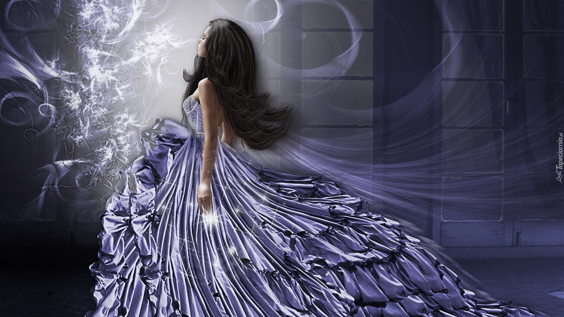 Edytor tapety: Kobieta, Brunetka, Liliowa, Sukienka