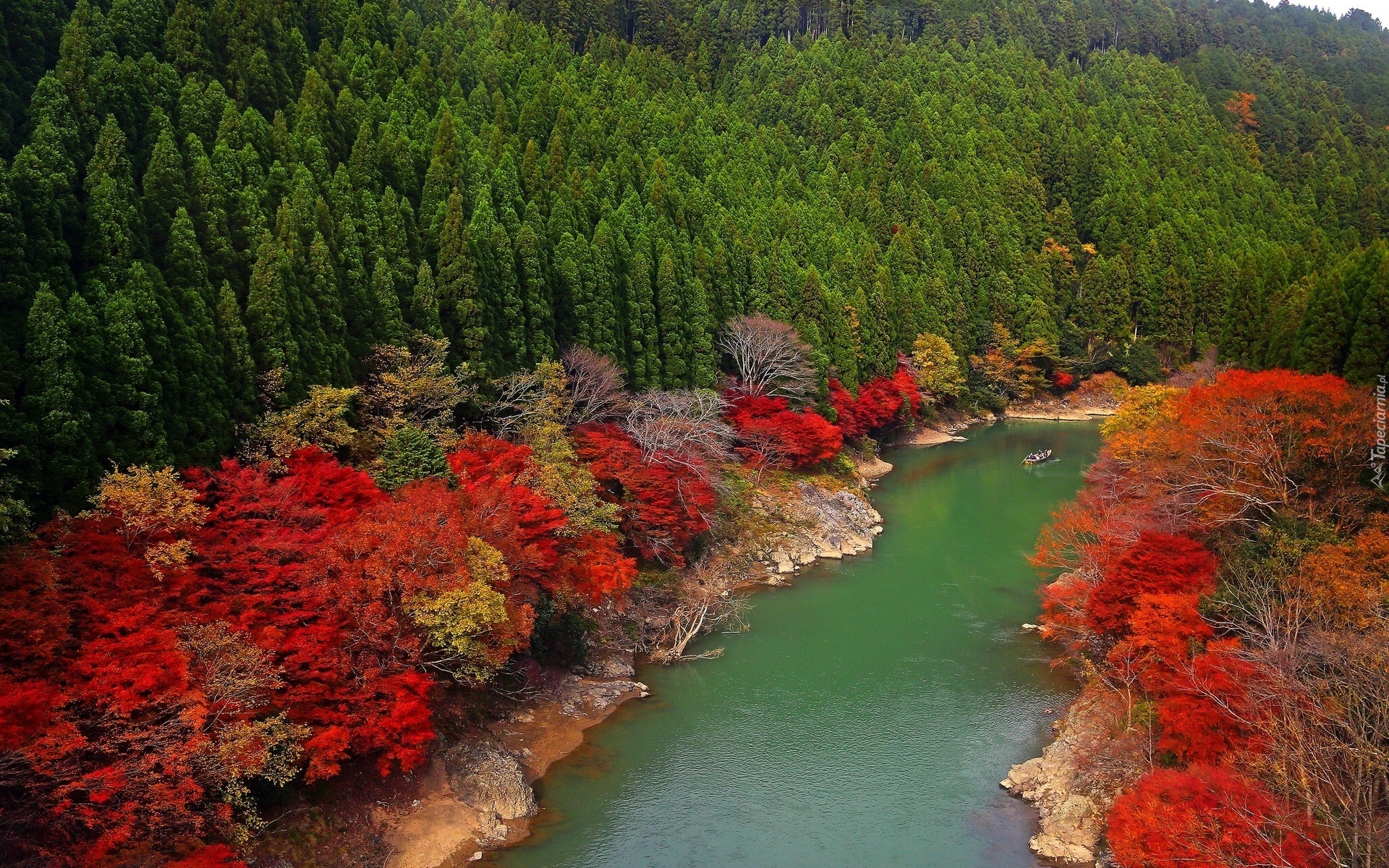 Edytor tapety: Rzeka, Lasy, Kolorowe, Drzewa, Łódka