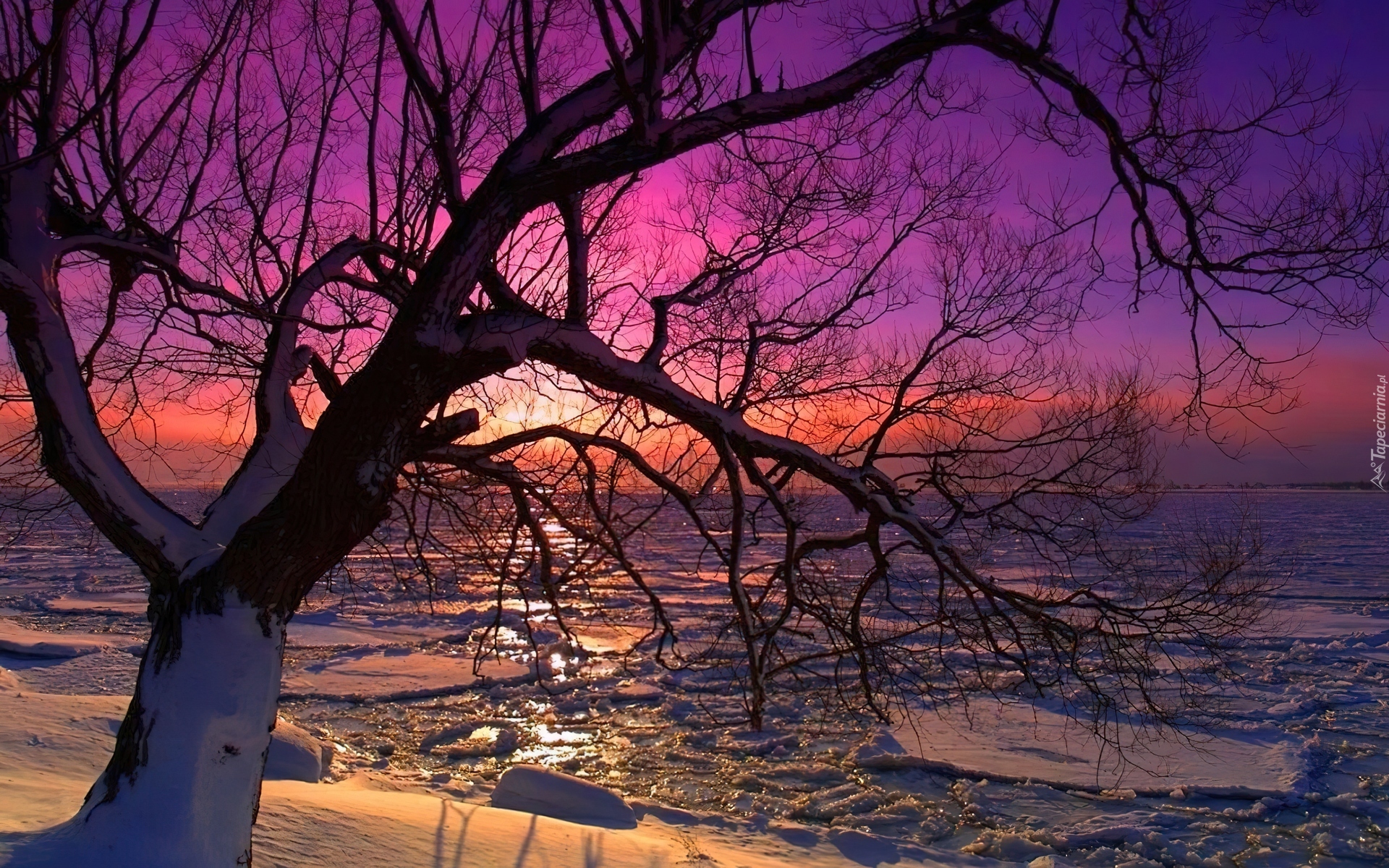 Edytor tapety: Zima, Drzewo, Zachód Słońca