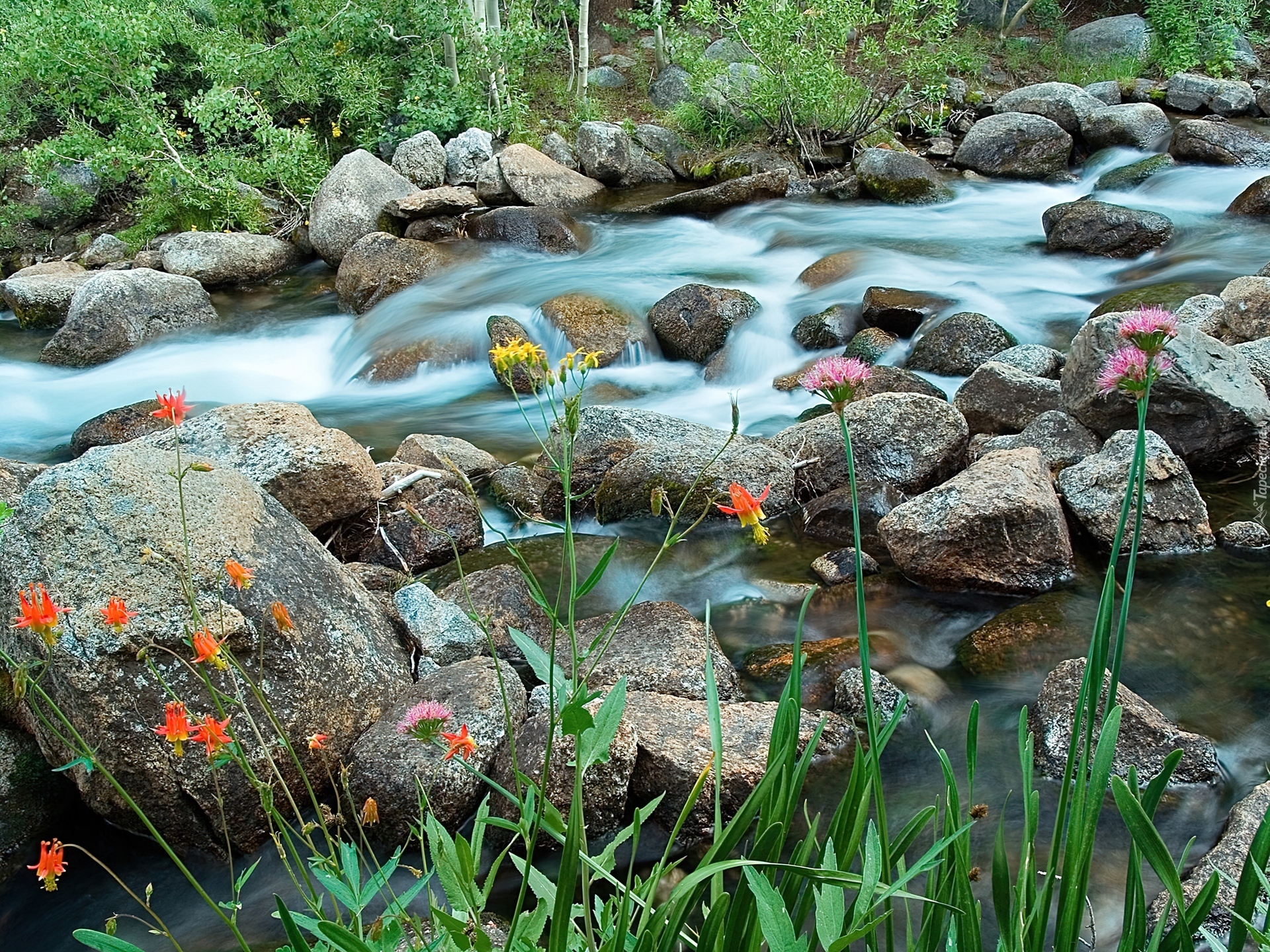 Edytor tapety: Rzeka, Kamienie, Kolorowe, Kwiatki