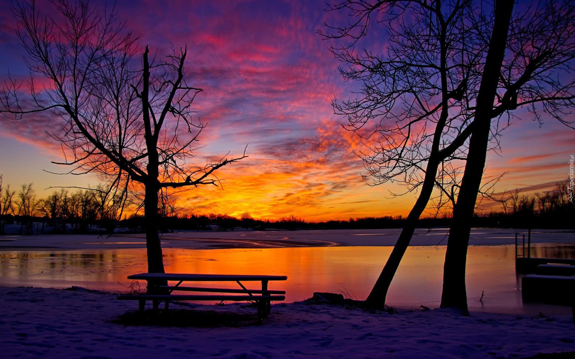 Edytor tapety: Rzeka, Drzewa, Ławka, Zachód, Słońca, Zima