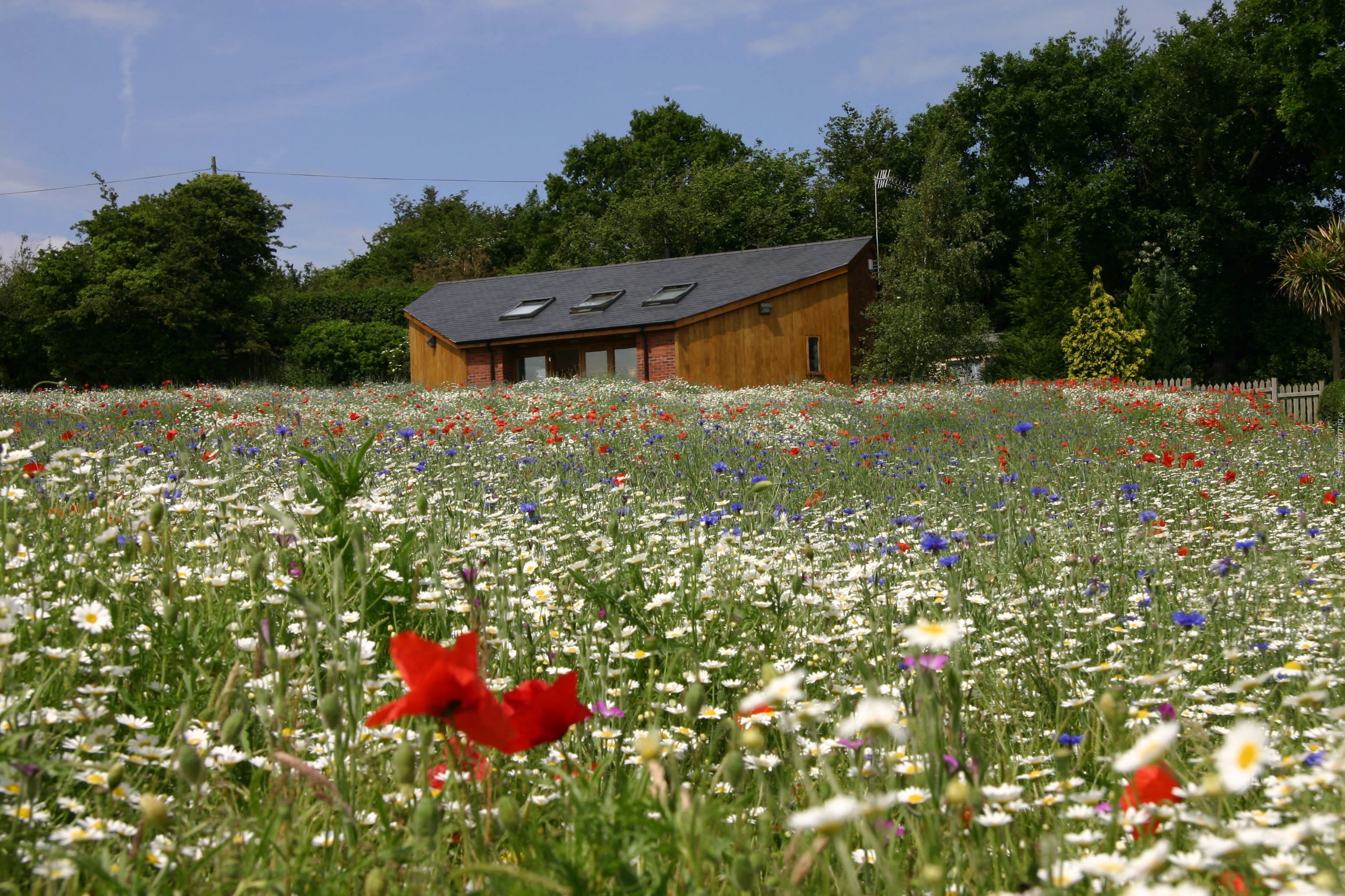 Edytor tapety: Łąka, Chabry, Margerytki, Maki, Budynek