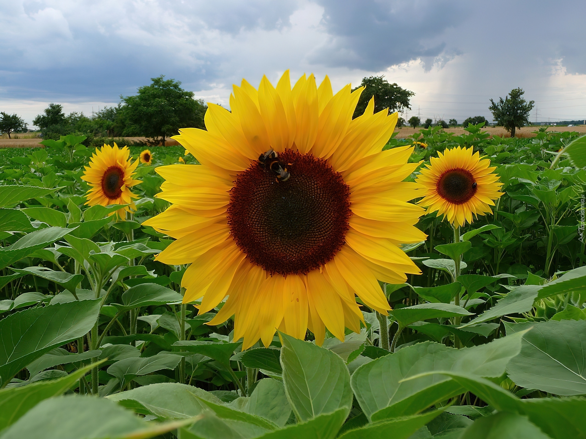 Edytor tapety: Pole, Słoneczników, Drzewa, Chmury