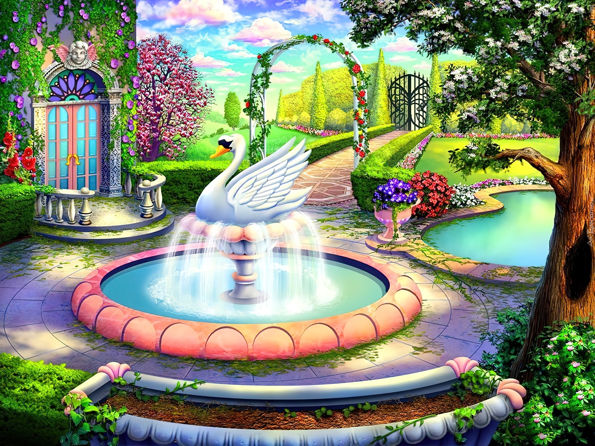 Edytor tapety: Fontanna, Łabędź, Dom, Ogród