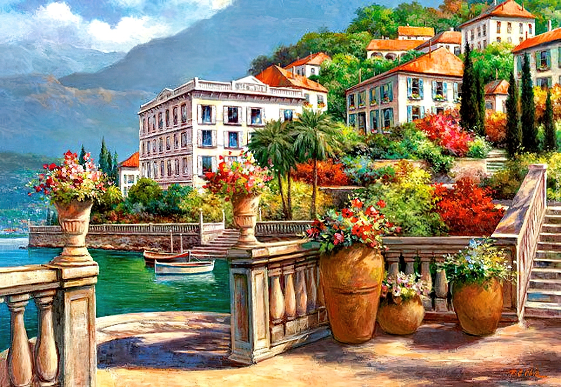 Edytor tapety: Domy, Morze, Taras, Kwiaty