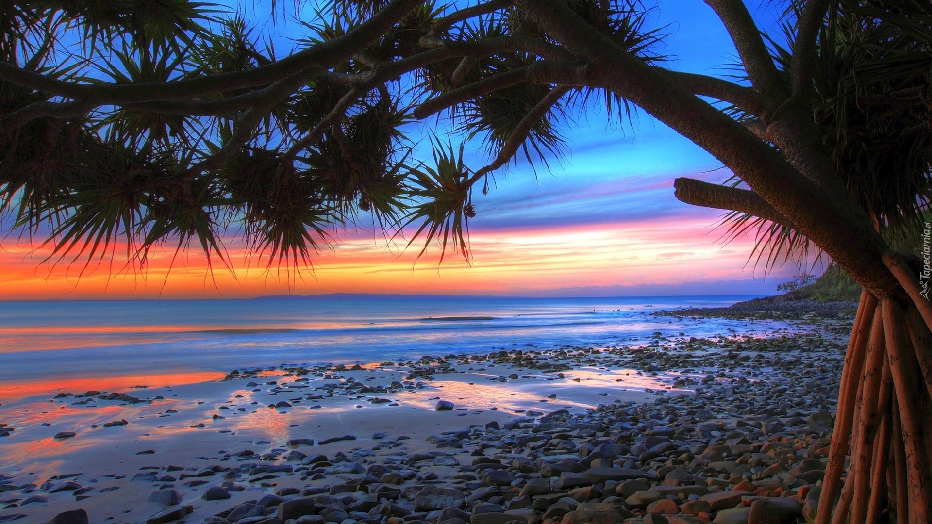 Edytor tapety: Zachód, Słońca, Plaża, Morze, Drzewo