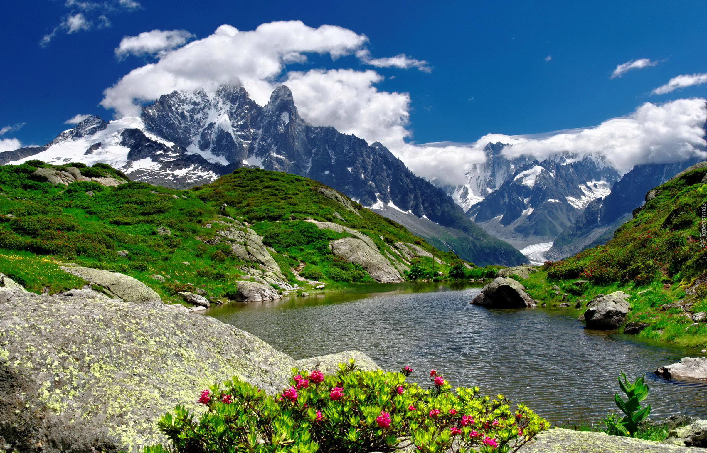 Edytor tapety: Rzeka, Kwiatki, Góry