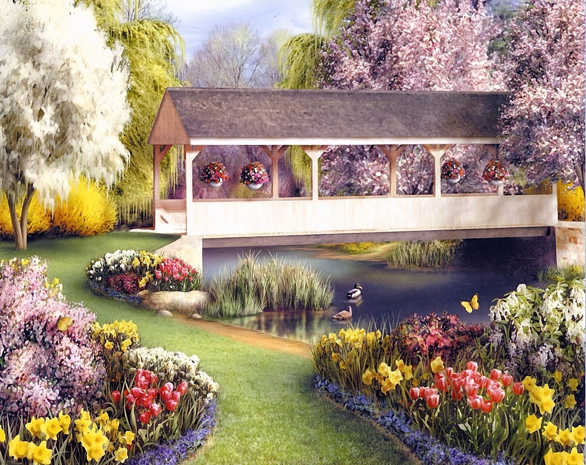 Edytor tapety: Ogród, Kryty, Most, Rzeka, Kwiaty