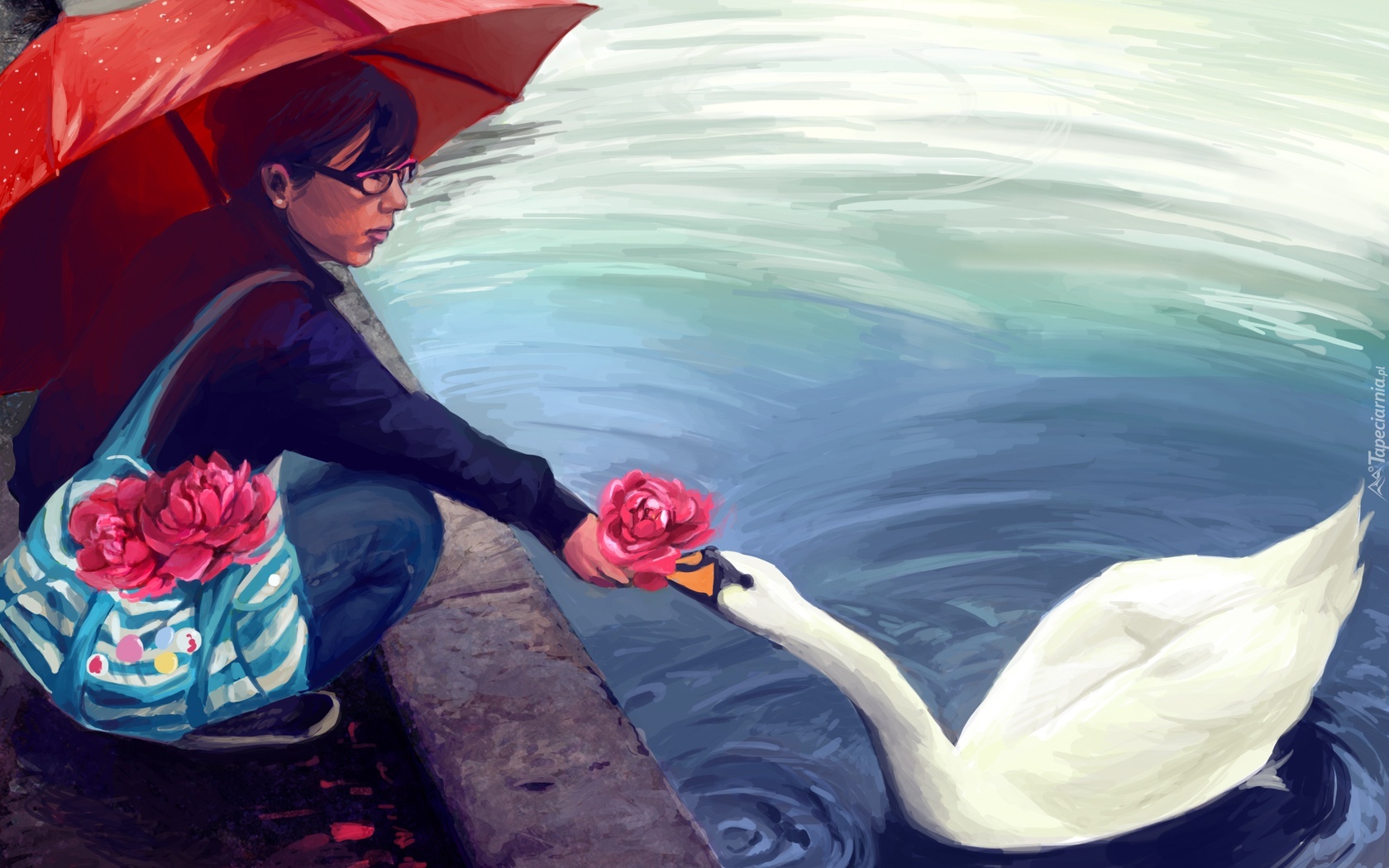 Edytor tapety: Dziewczyna, Czerwony, Parasol, Łabędź, Kwiaty