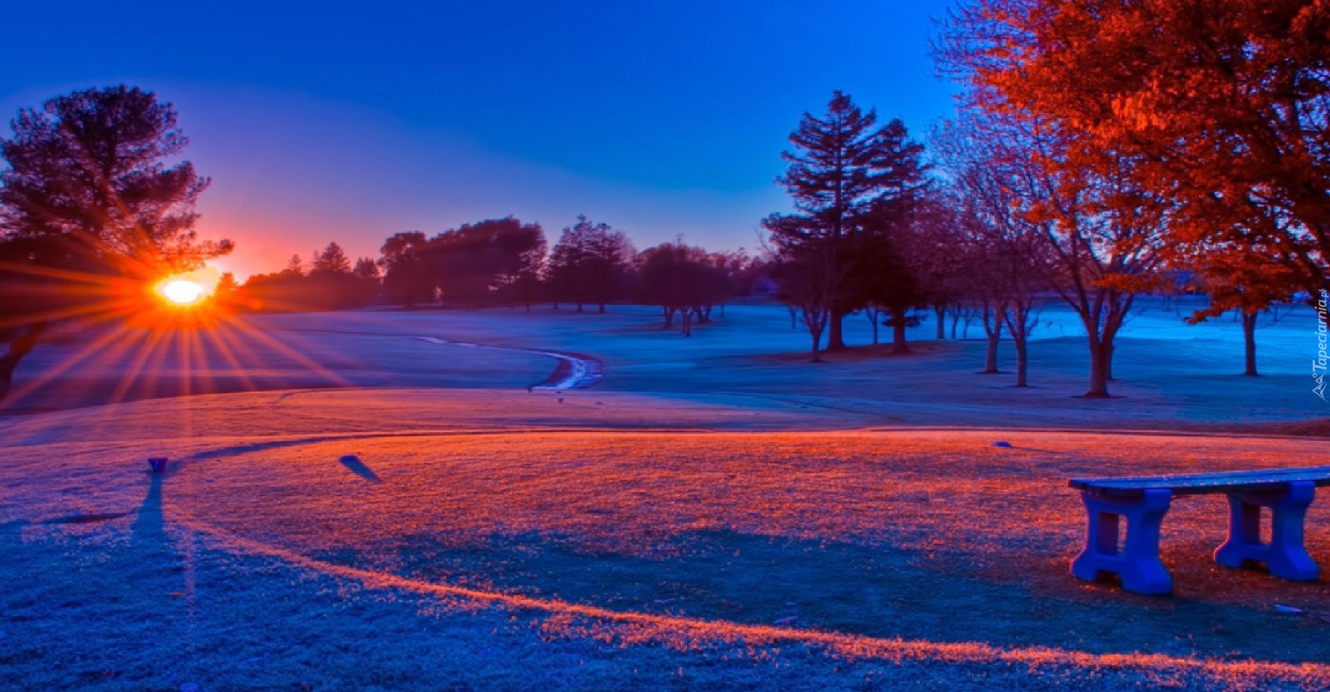 Edytor tapety: Zima, Park, Ławeczka, Drzewa, Zachód Słońca
