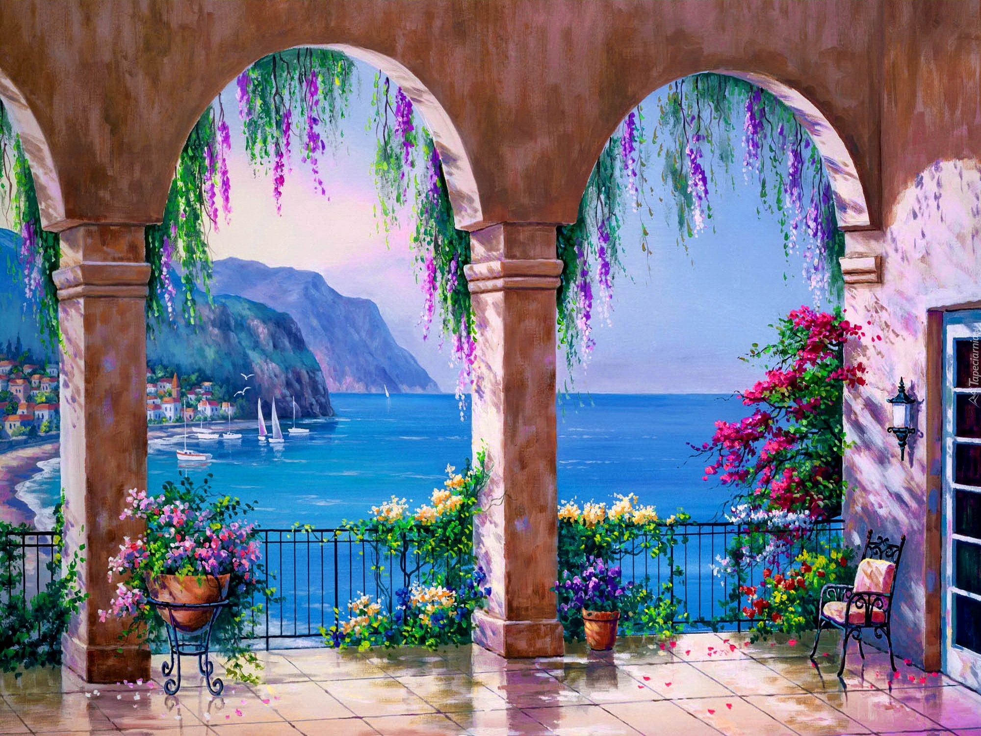 Edytor tapety: Taras, Kwiaty, Widok, Morze