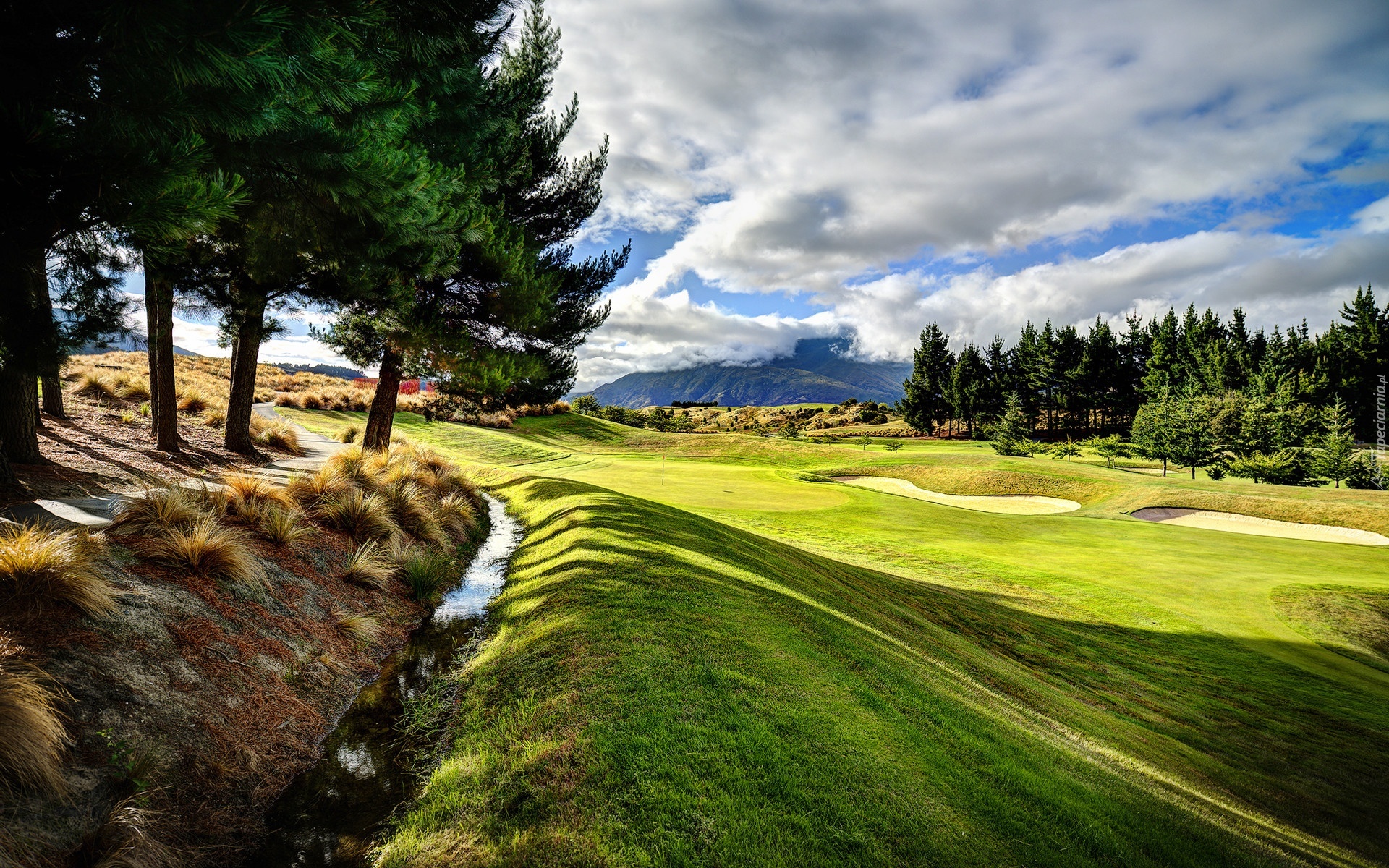 Edytor tapety: Łąka, Pole, Golfowe, Las, Chmury
