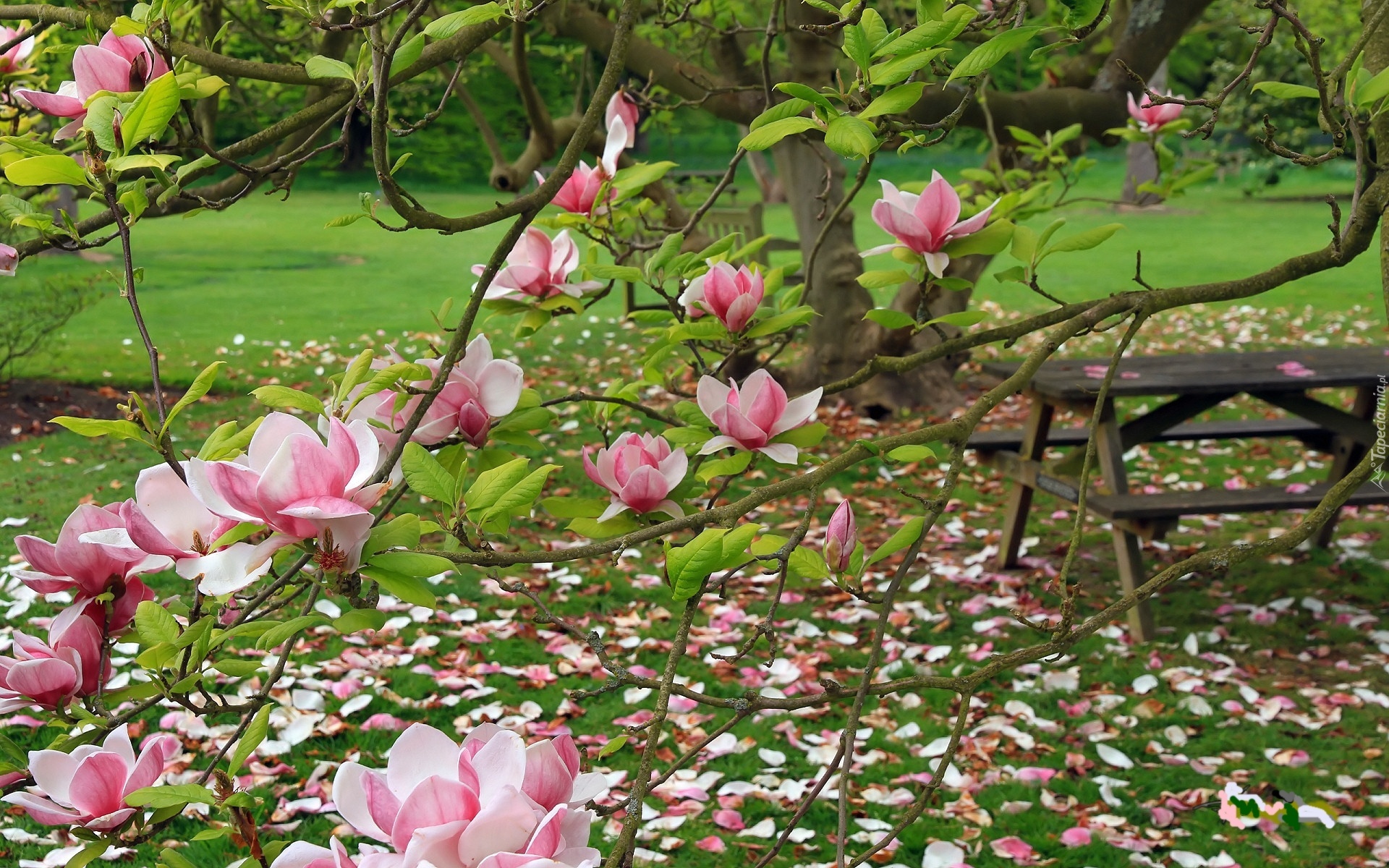 Edytor tapety: Ogród, Różowa, Magnolia, Stolik