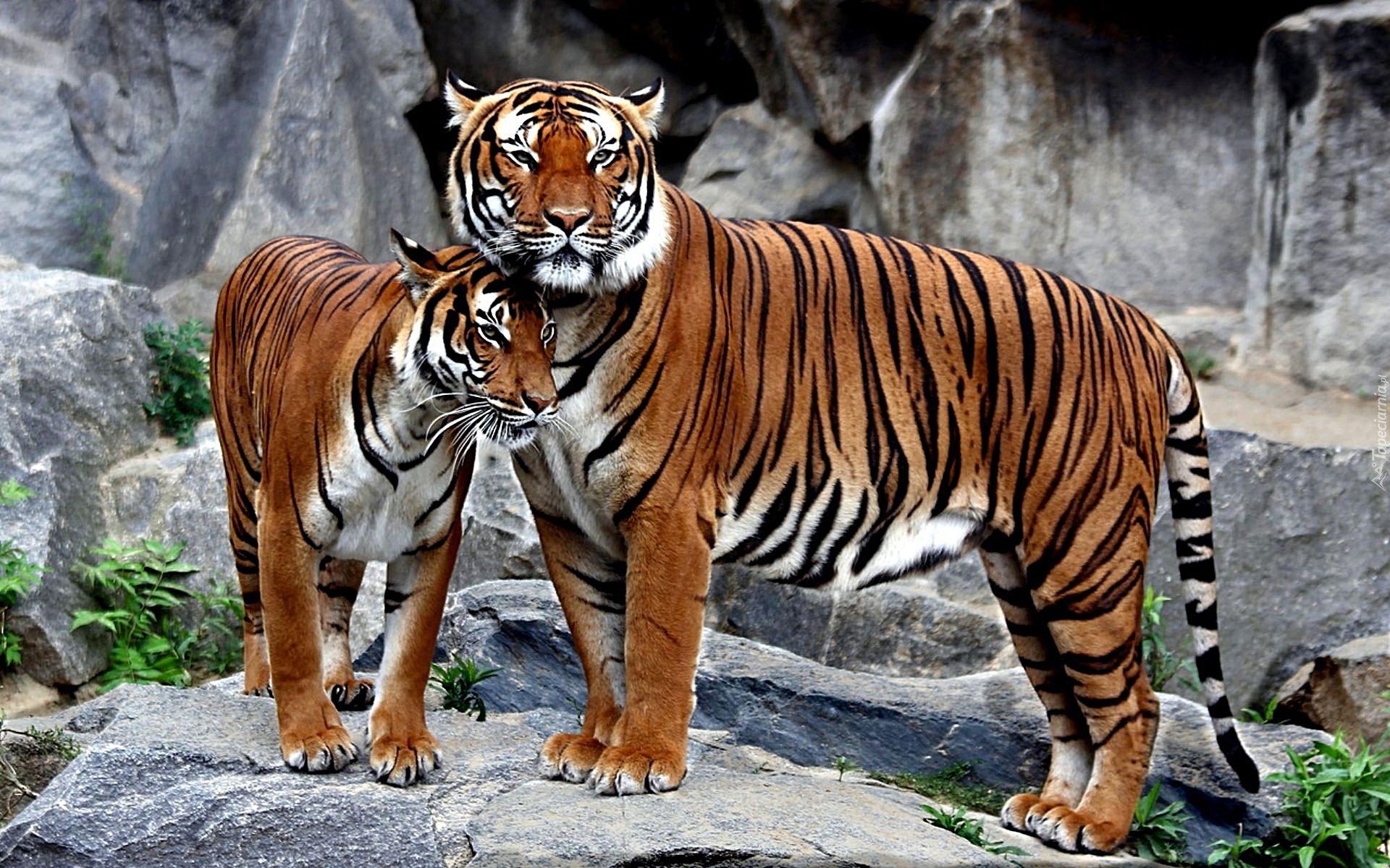 Edytor tapety: Dwa, Tygrysy, Para, Skały