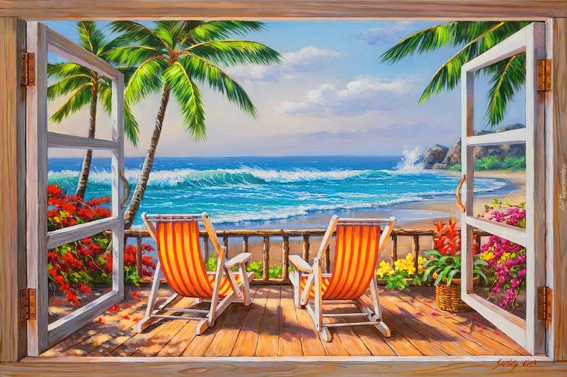 Edytor tapety: Okno, Widok, Taras, Leżaki, Morze, Palmy, Wakacje