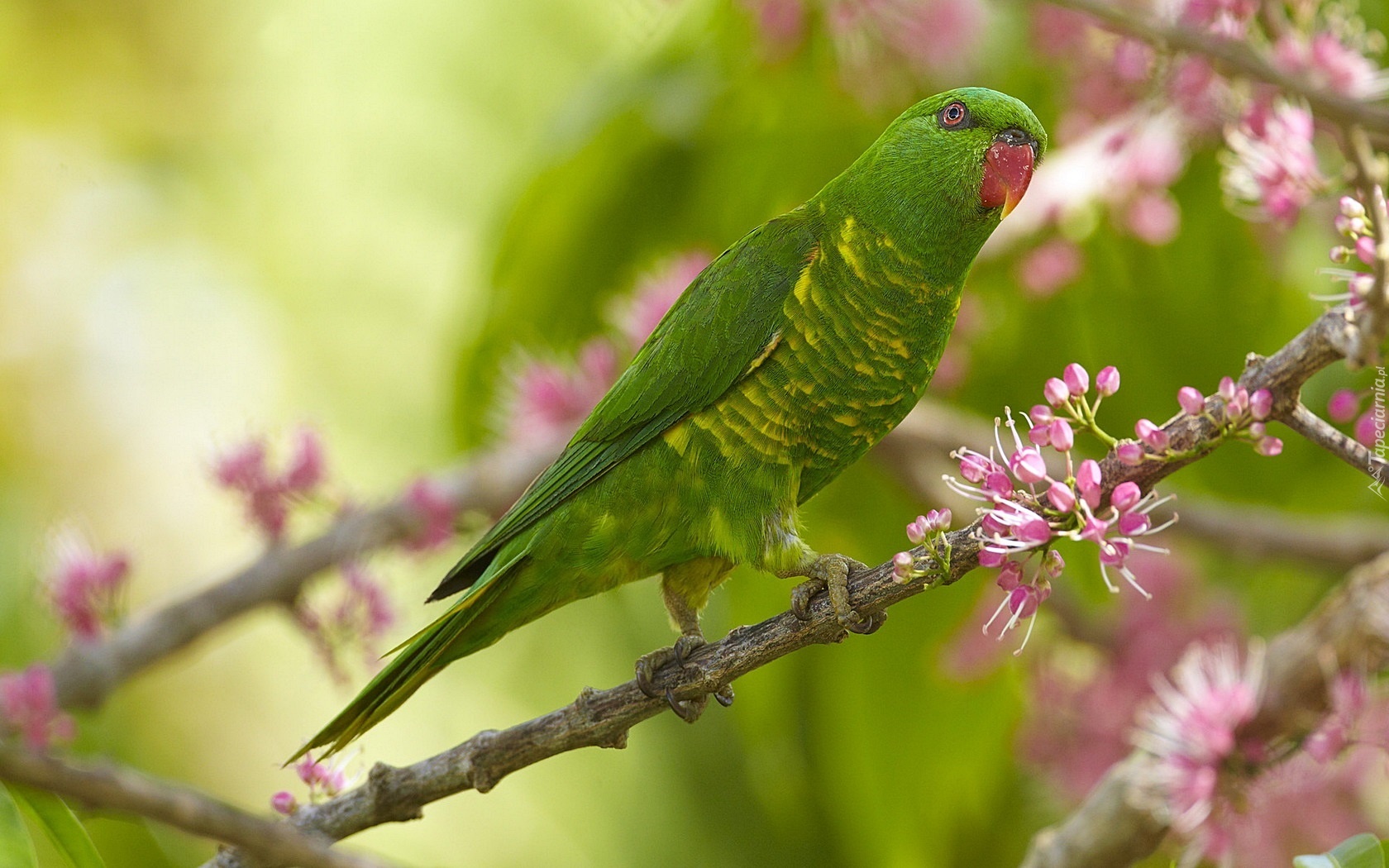 Edytor tapety: Zielona, Papuga, Kwitnąca, Gałązka