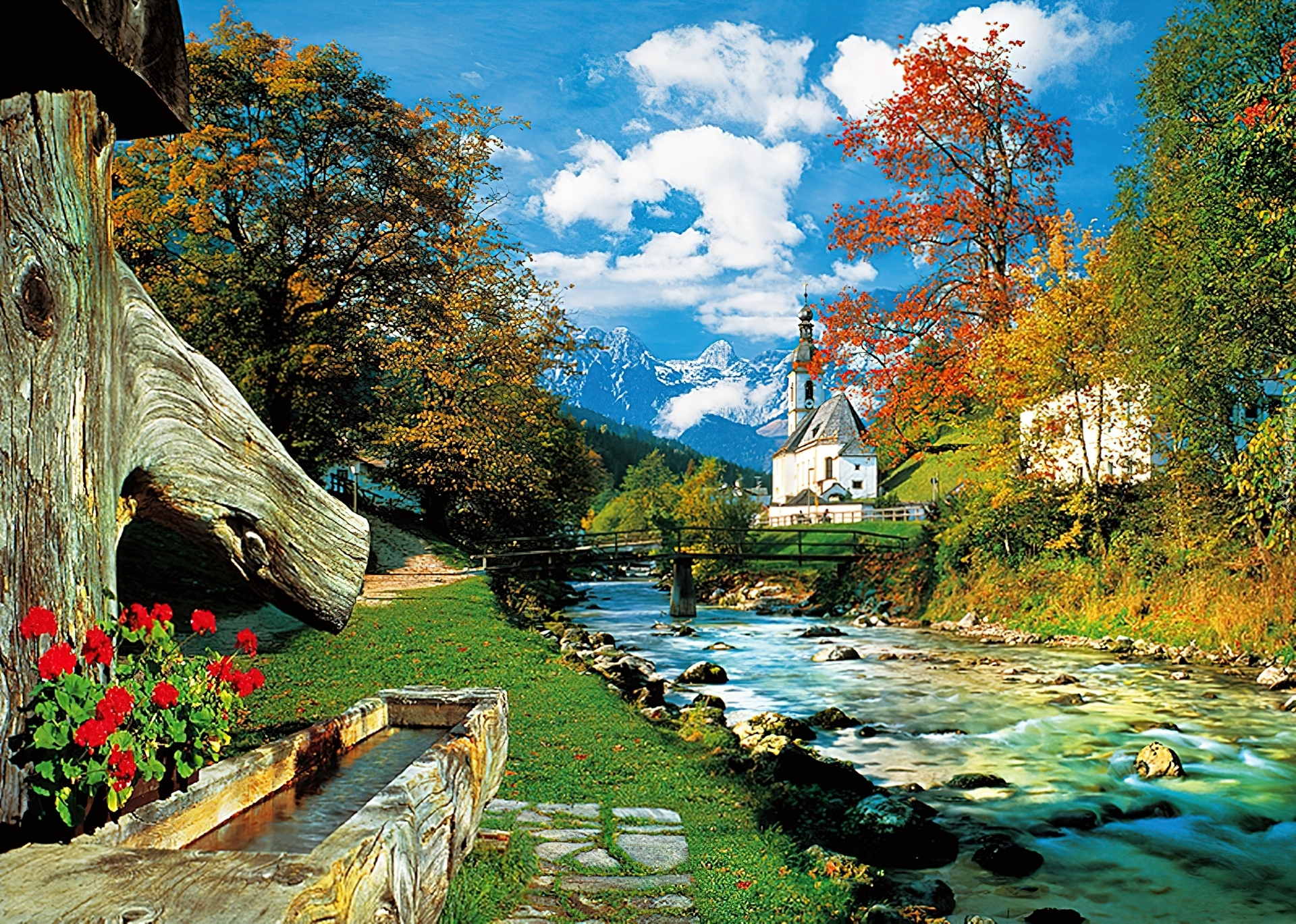 Edytor tapety: Rzeka, Mostek, Kościółek, Drzewa