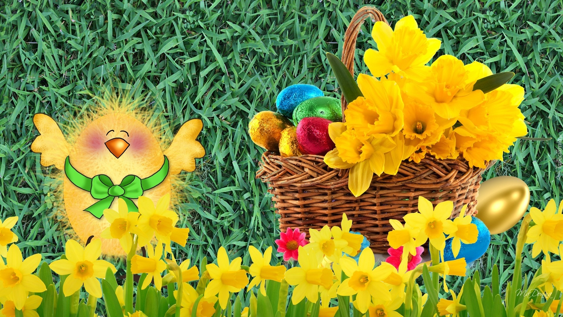 Edytor tapety: Wielkanoc, Kolorowe, Pisanki, Koszyczek, Kurczaczek, Żonkile