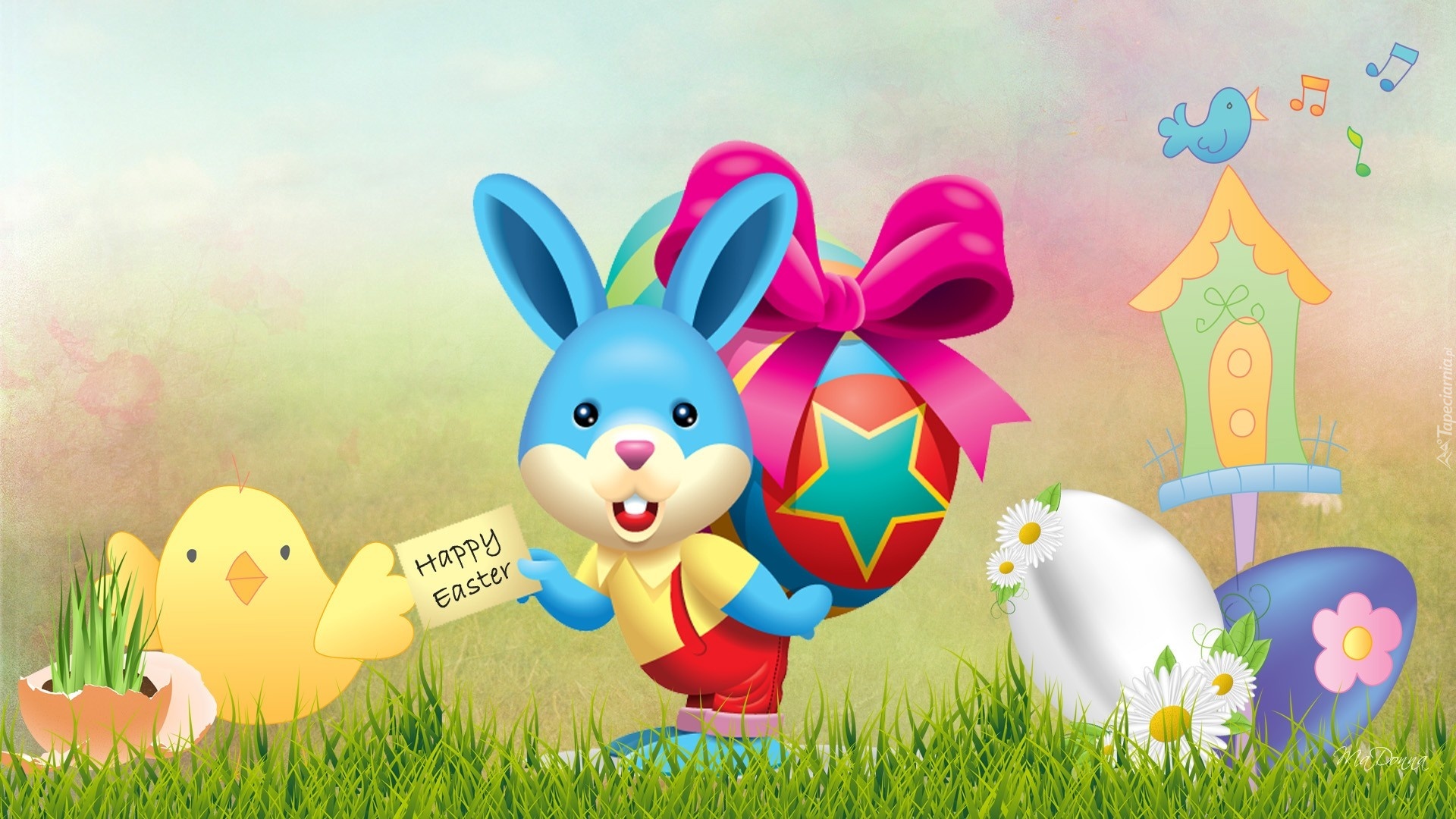 Edytor tapety: Wielkanoc, Kolorowe, Pisanki, Kwiatki, Kurczaczek, Zajączek