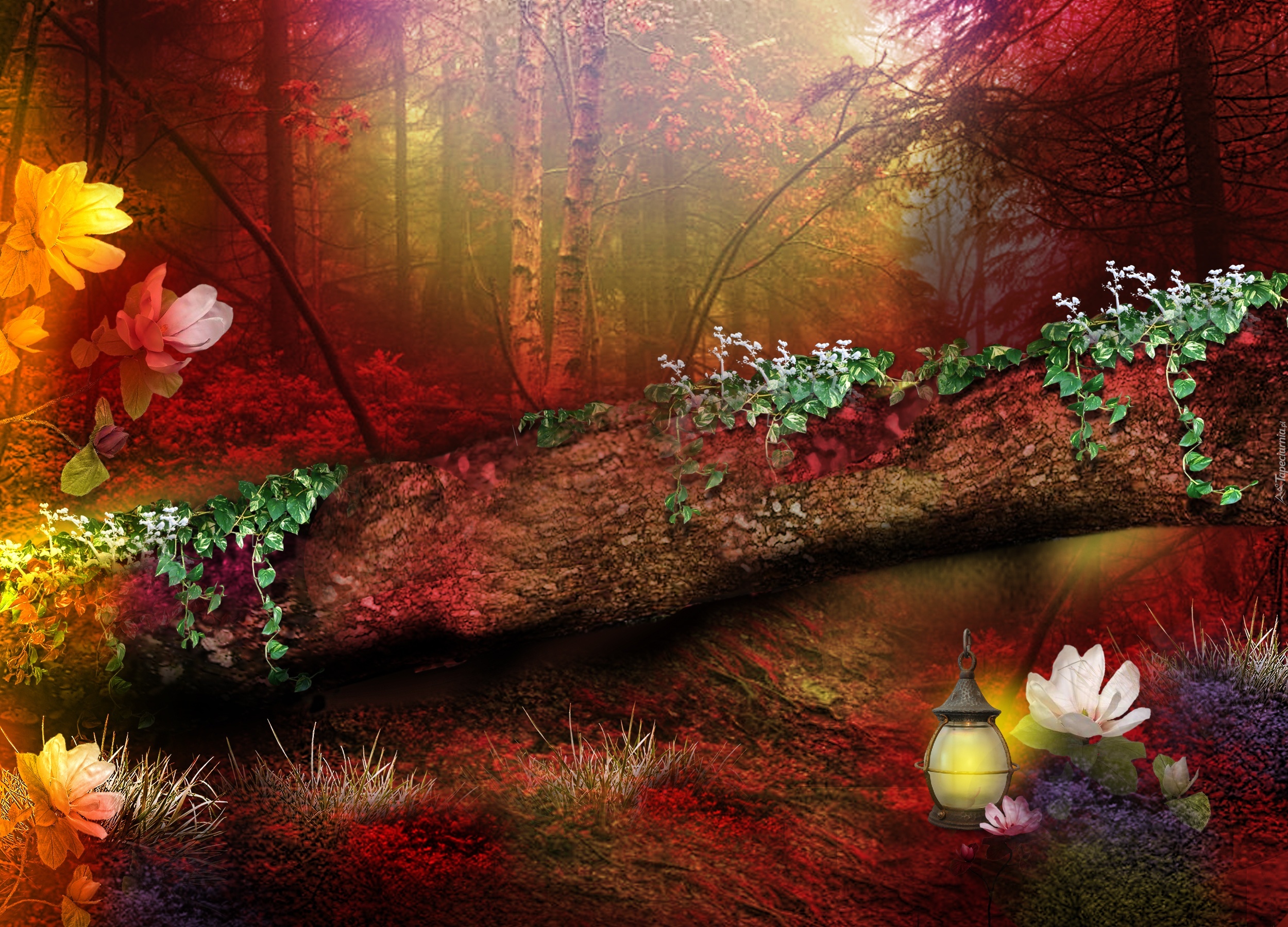 Edytor tapety: Las, Kwiaty, Pień, Drzewa, Lampa