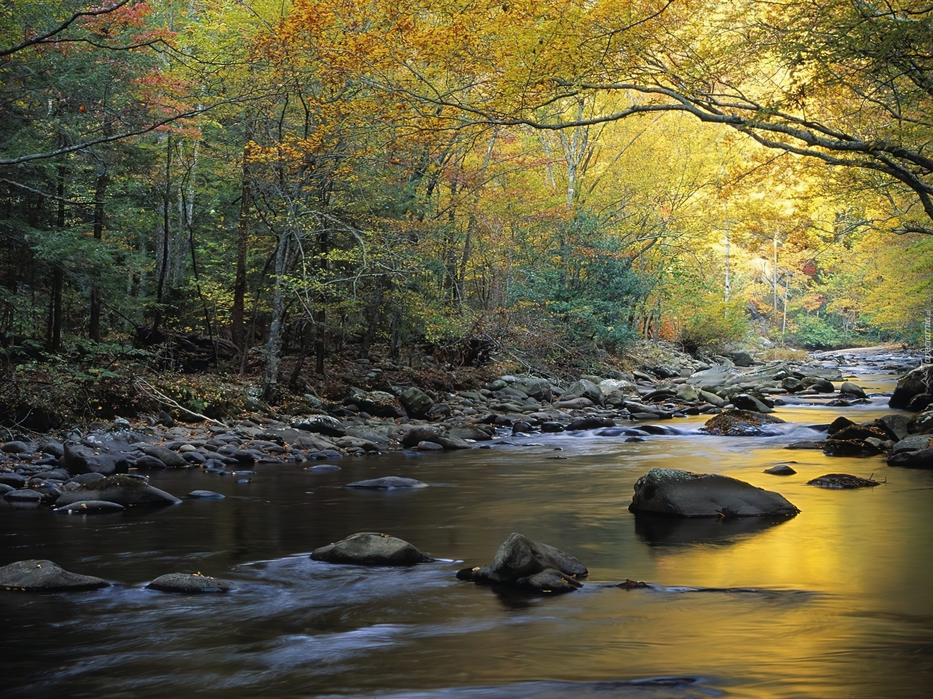 Edytor tapety: Las, Strumień, Kamienie, Przebijające, Światło