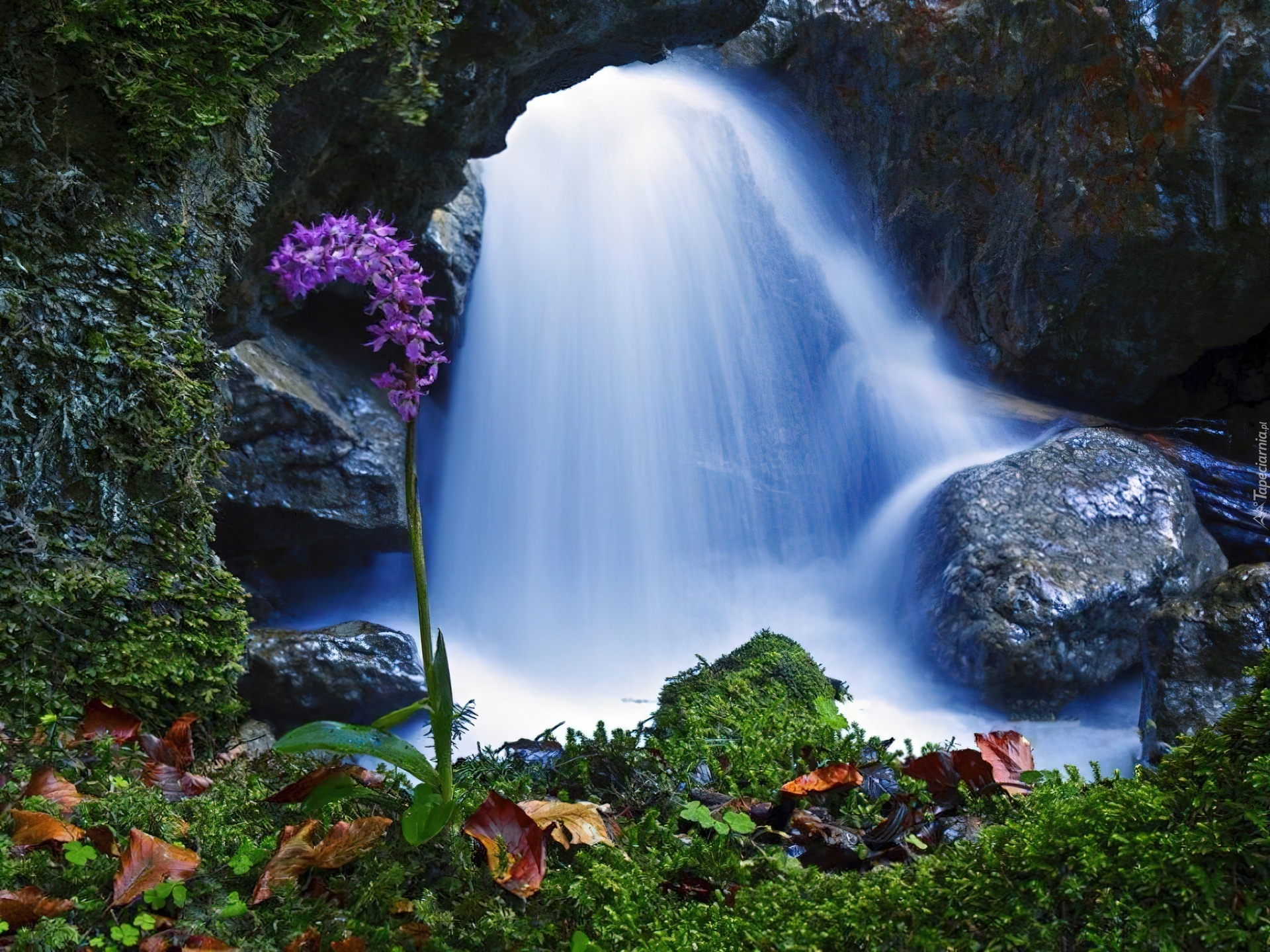 Edytor tapety: Wodospad, Kamienie, Kwiatki