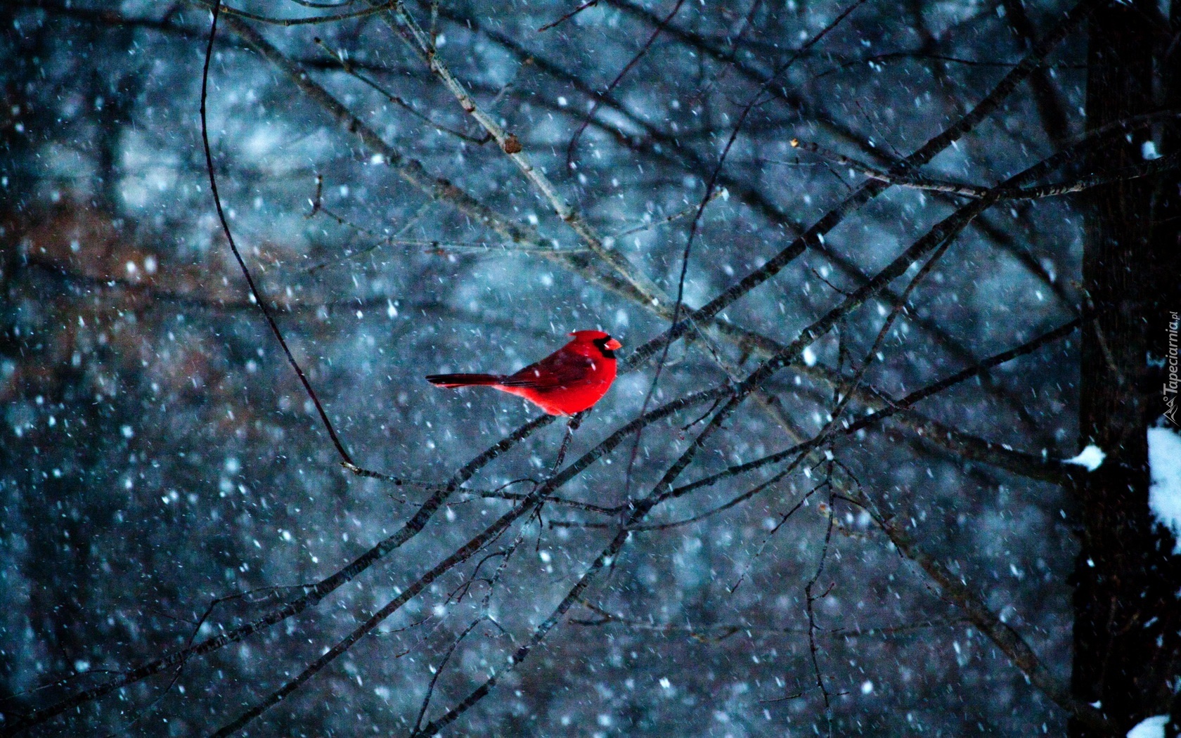 Edytor tapety: Czerwony, Ptaszek ,Gałęzie, Śnieg