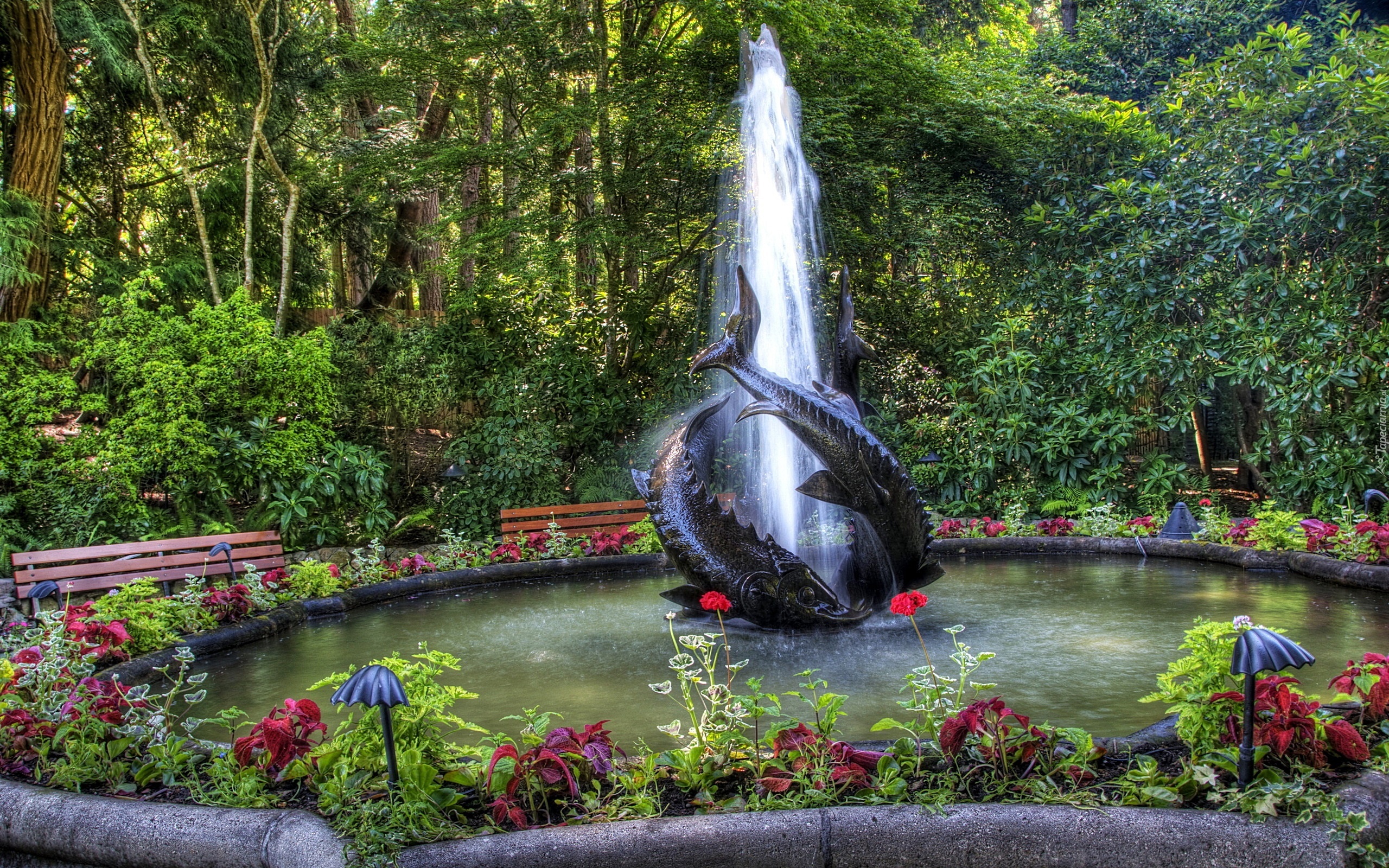 Edytor tapety: Fontanna, Ogród, Drzewa, Kwiaty