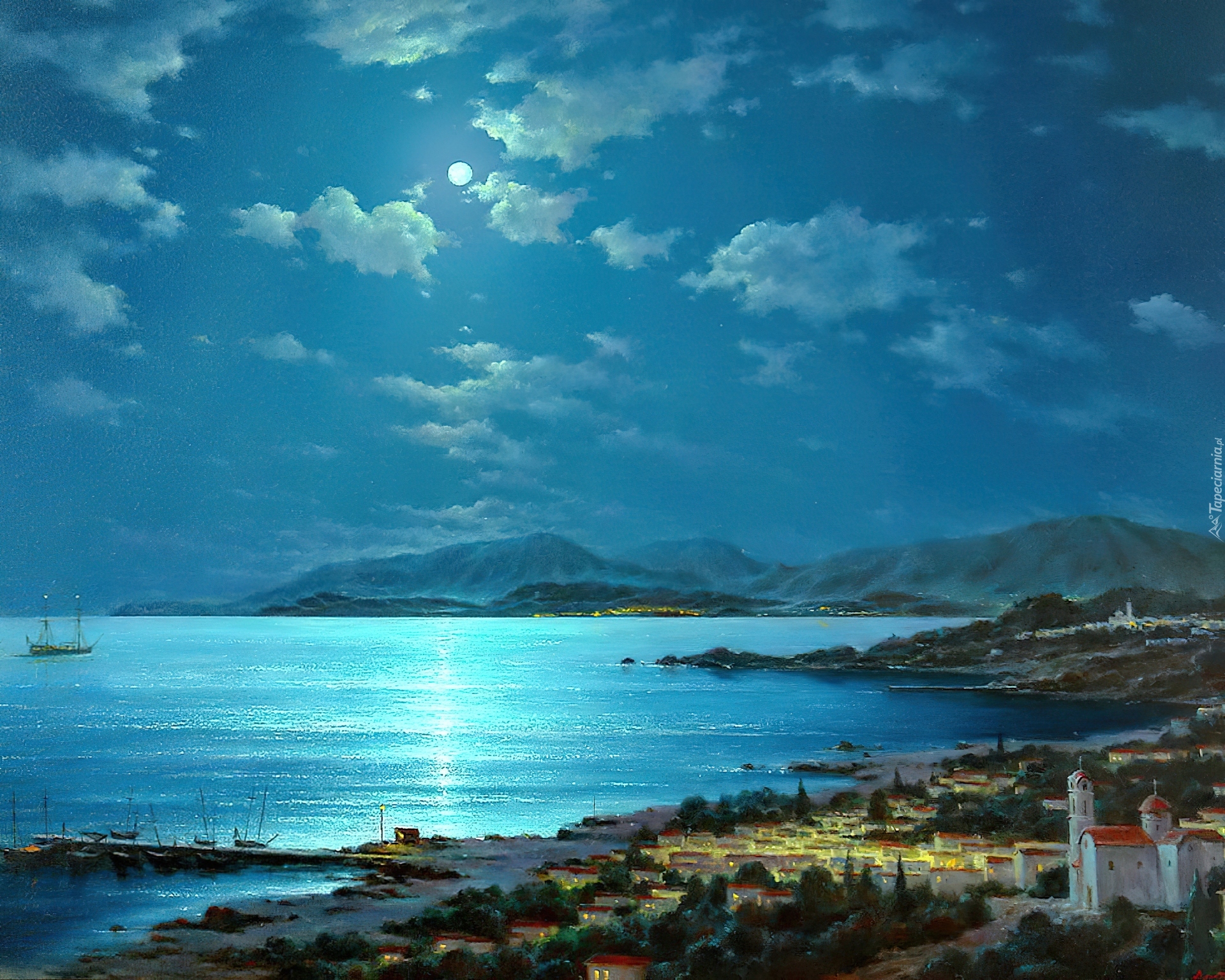 Edytor tapety: Morze, Góry, Noc, Miasteczko
