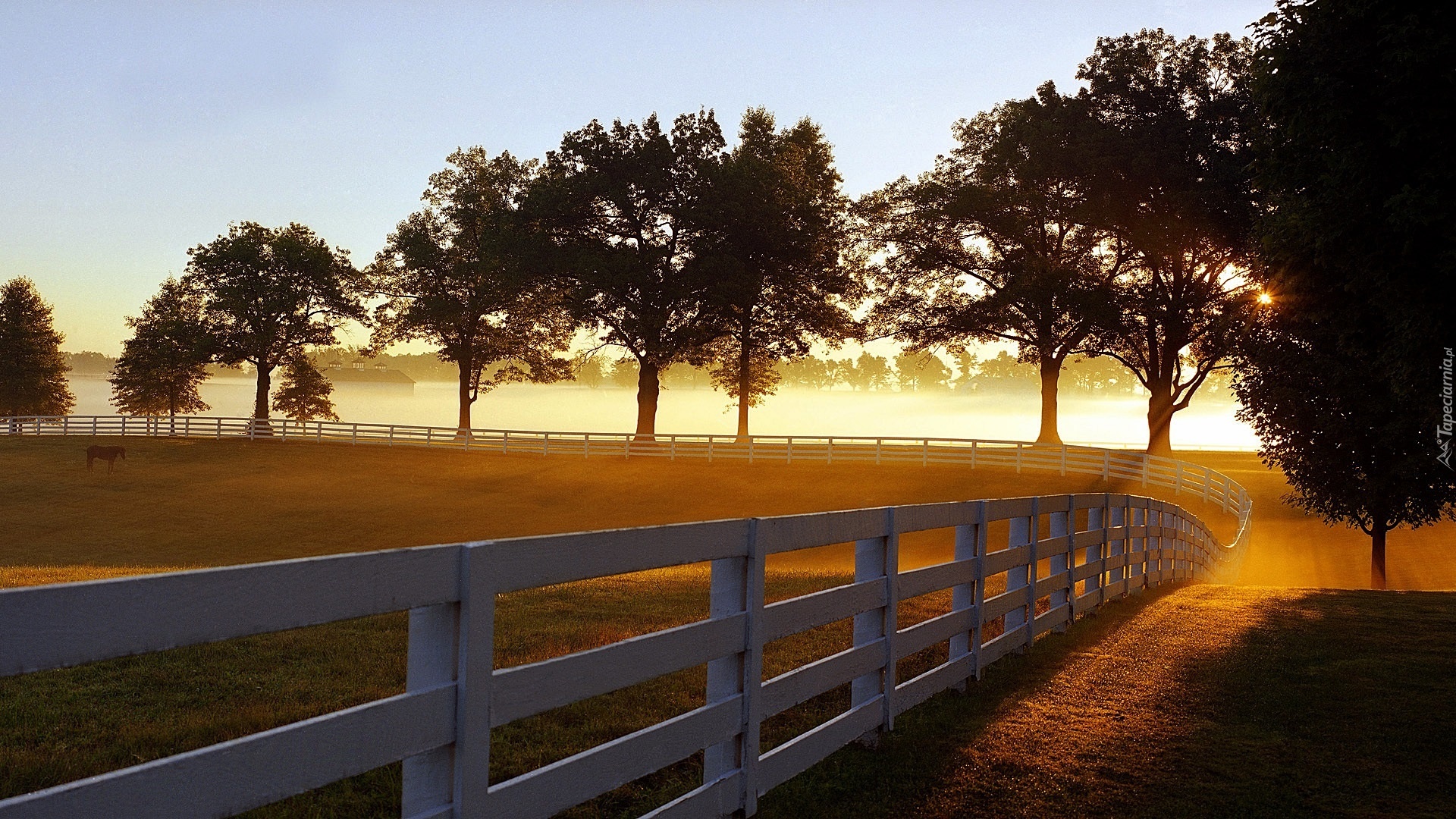 Edytor tapety: Łąka, Mgła, Drzewa, Promienie, Słońca
