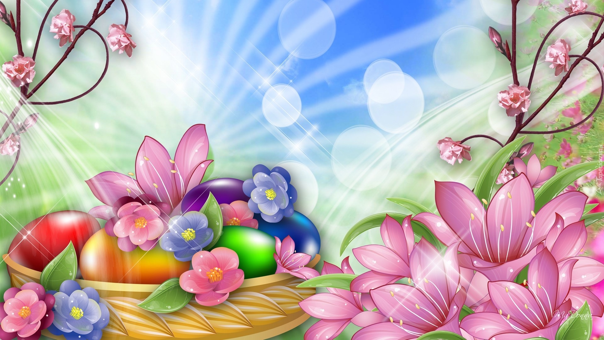 Edytor tapety: Wielkanoc, Kolorowe, Pisanki, Koszyczek, Kolorowe, Kwiatki