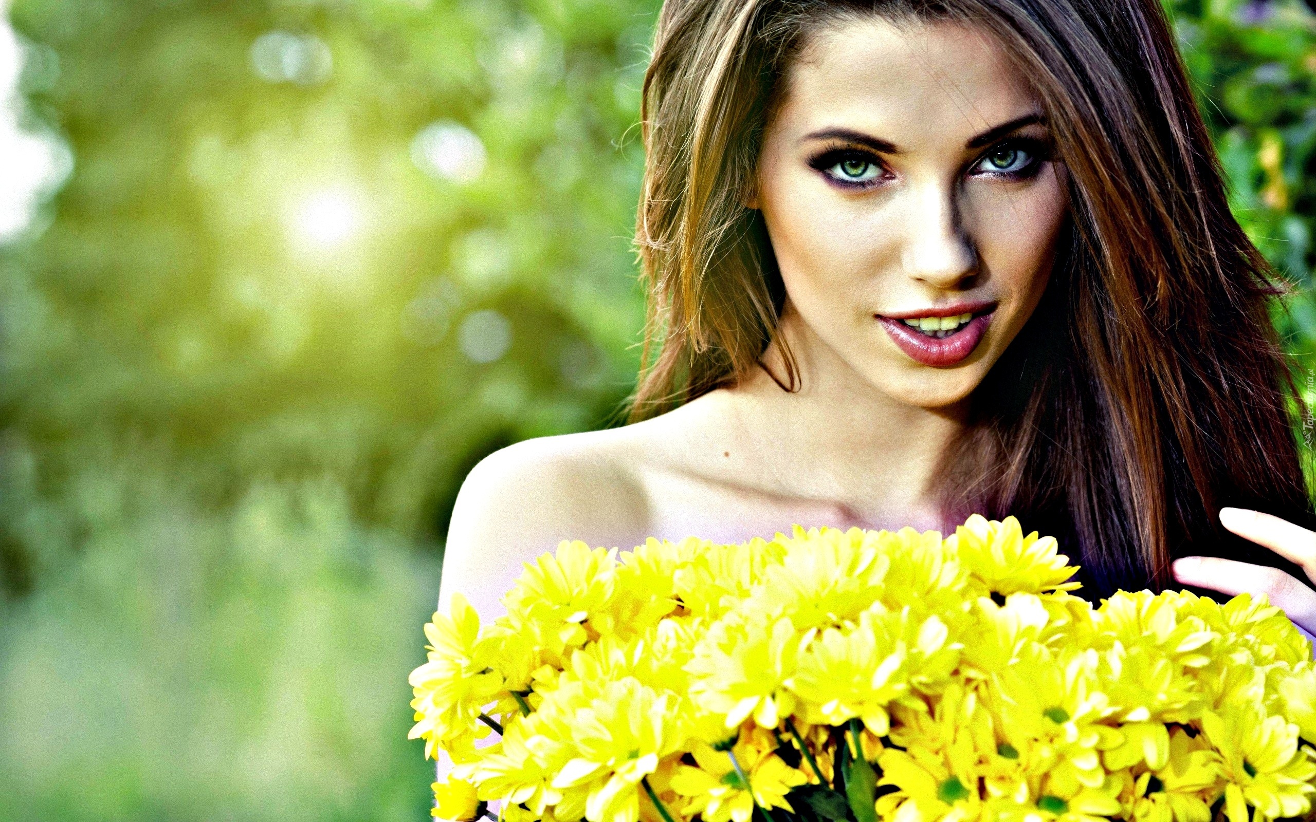 Edytor tapety: Dziewczyna, Szatynka, Uśmiech, Bukiet, Złocieni