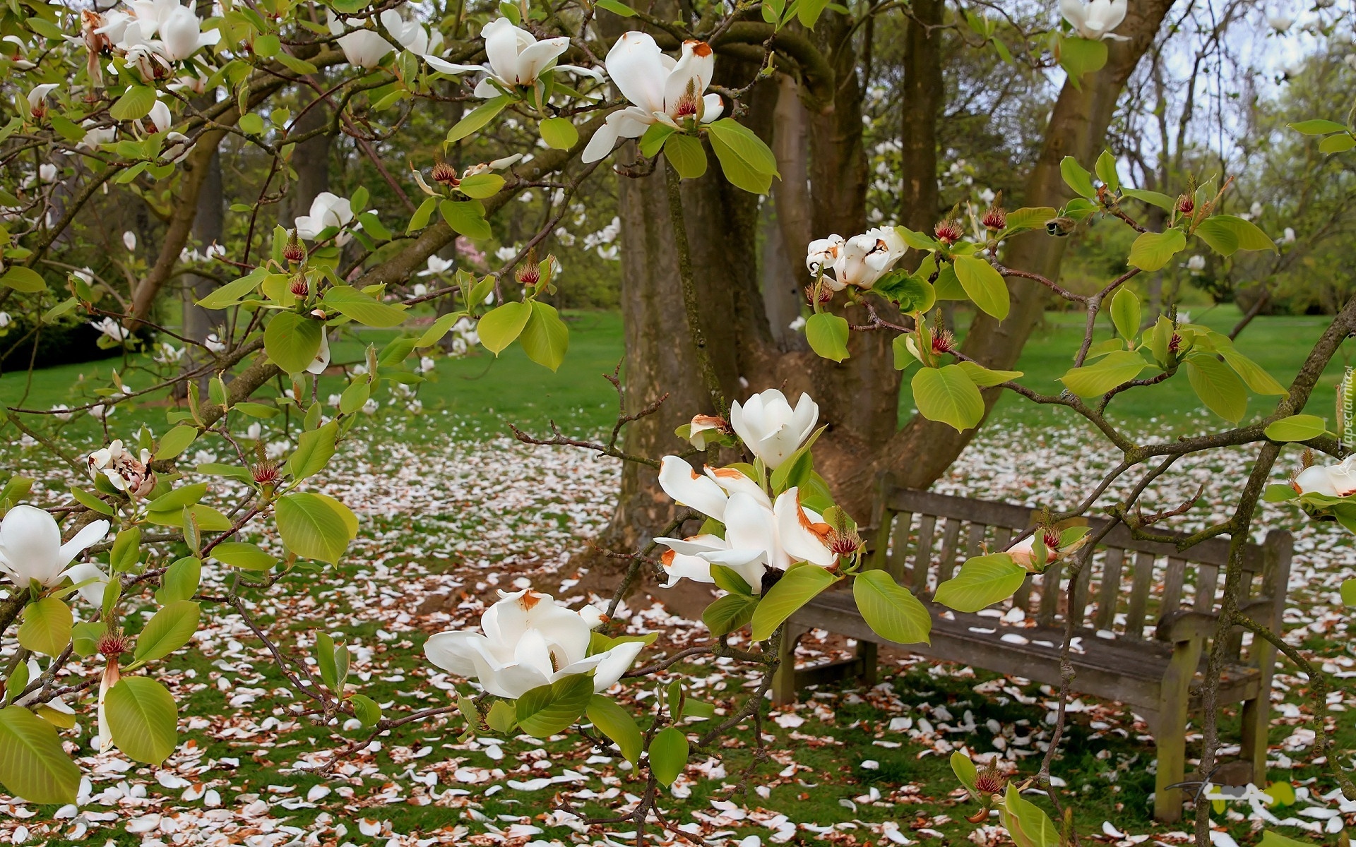 Edytor tapety: Wiosna, Park, Biała, Magnolia, Ławeczka