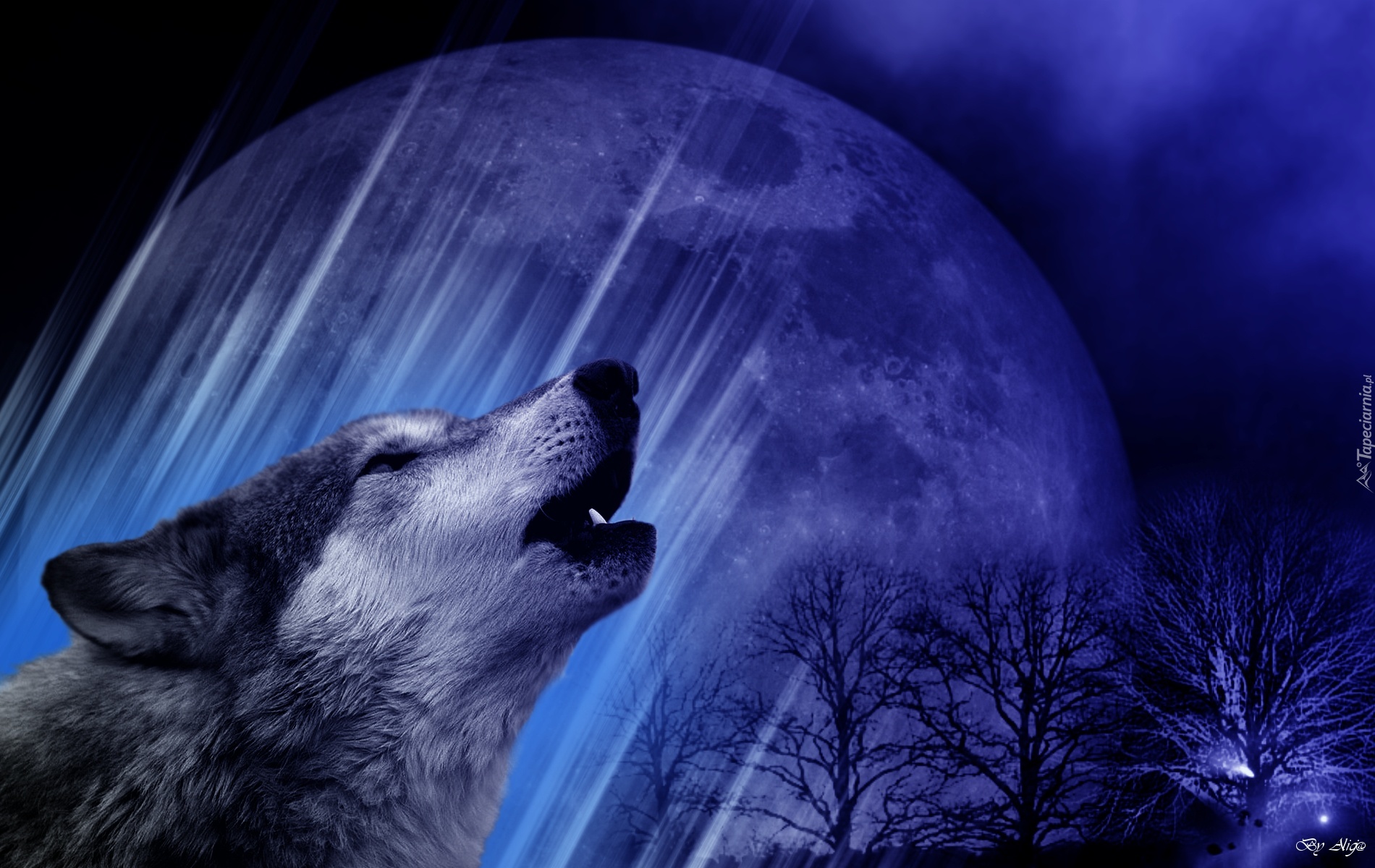 Edytor tapety: Wilk, Księżyc, Drzewa